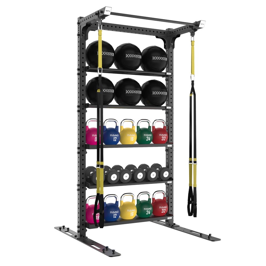 Рама TRX со стеллажом Vertex GETN GMC030 с двумя подвесами для функцуиональных петель и 5-ю полками для хранения спортинвентаря является компактным решением для залов с ограниченным пространством. На верхней части рамы расположен турник для работы с собственным весом. Крепления для TRX могут быть закреплены при сборке в любое из отверстий в верхней перфорированной балке, по желанию пользователя. На стойке есть возможность хранить петли, канаты, фитнес-резинки, скакалки, пояса, гантели, гири, медболы и слэмболы, сэнбэги, болгарские сумки, и многое другое. Изготовлена из 4 мм стали и покрыта двухслойным покрытием черного цвета. Ножки станции снабжены отверстиями для крепления к полу.