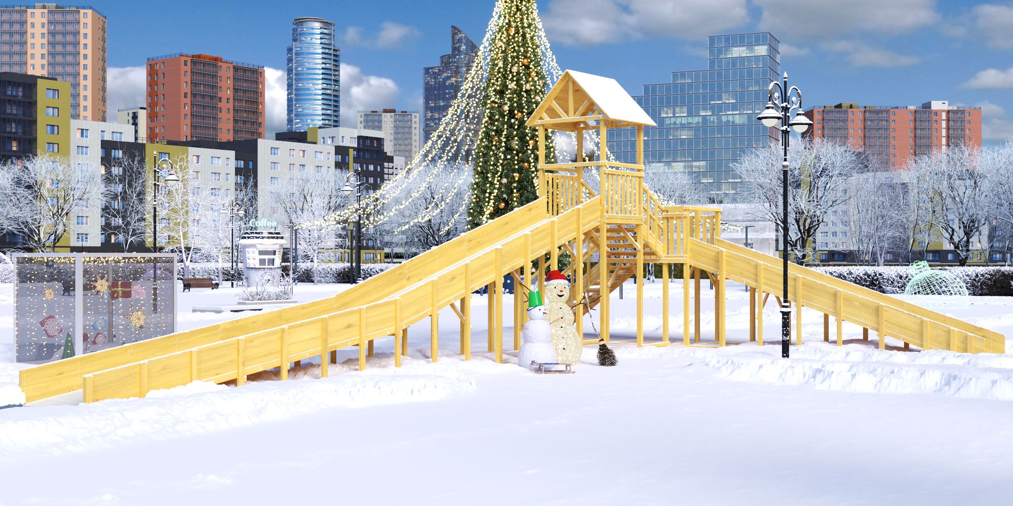 Зимняя горка сделана из экологичного клееного бруса. Этот природный материал обладает особой стойкостью и отлично переносит любые погодные условия. А благодаря передовым технологиям обработки наши детские комплексы из клееного бруса не дают усадки и сохраняют геометрию на протяжении всего срока службы. Материалы сертифицированы и соответствуют ГОСТ.