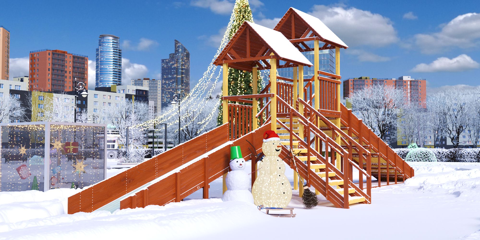 Конструкция всех наших детских зимних горок разработана и произведена по ГОСТ. Каркас, воспринимающий нагрузку, сделан из клееного бруса и обработан сертифицированным лакокрасочным покрытием. Часть элементов