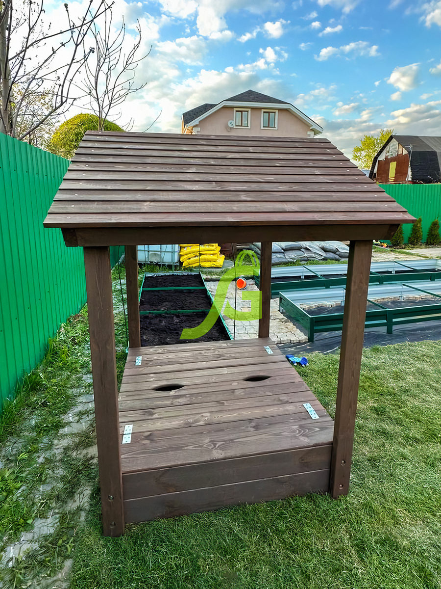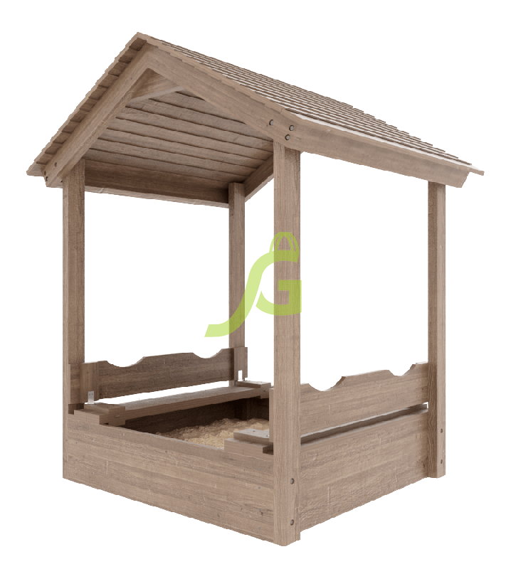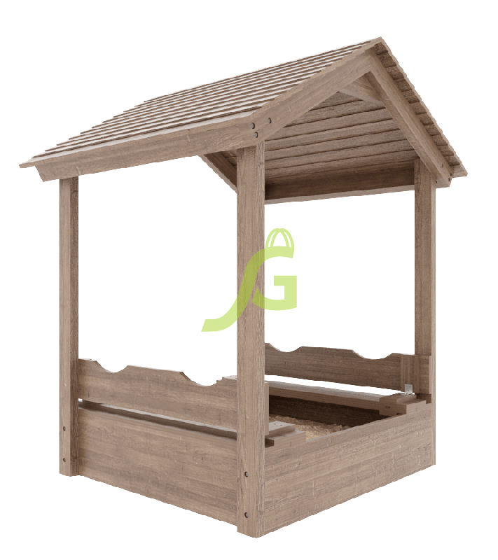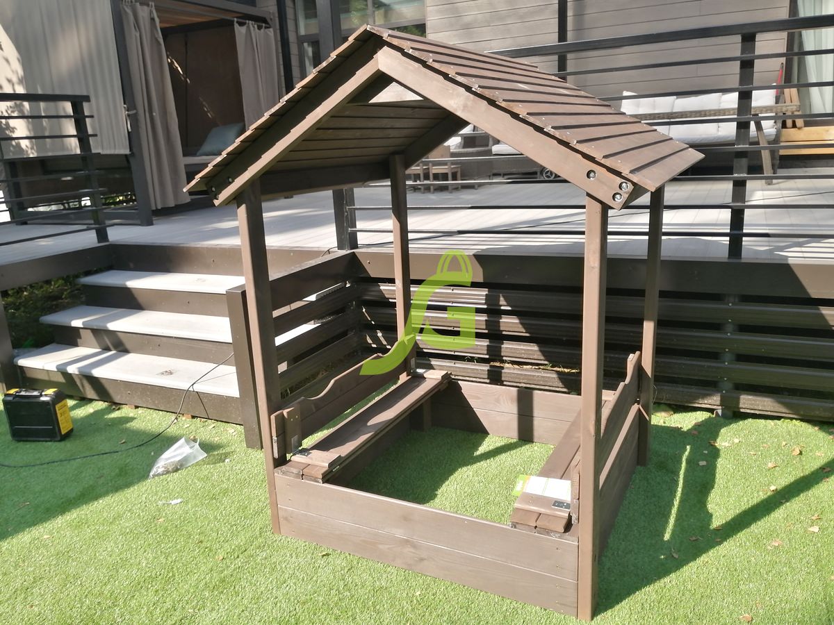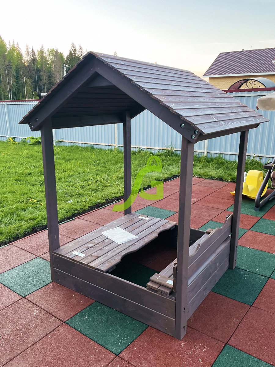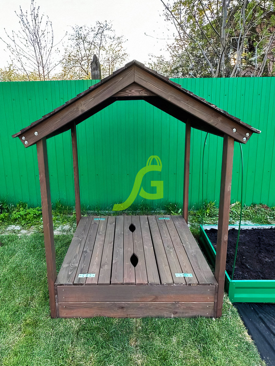 Детская игровая песочница с крышкой и деревянной крышей.