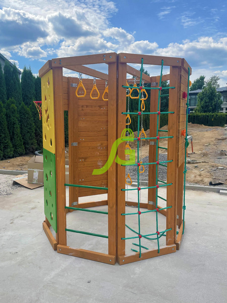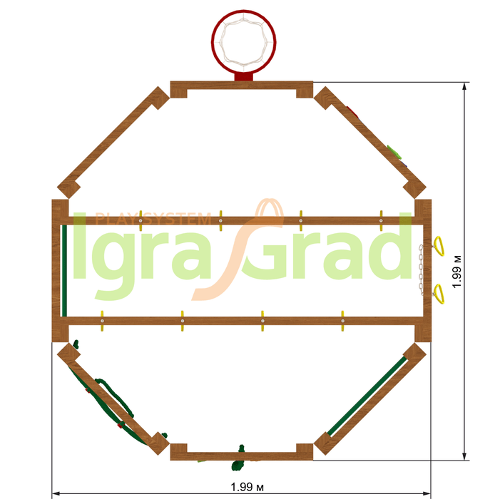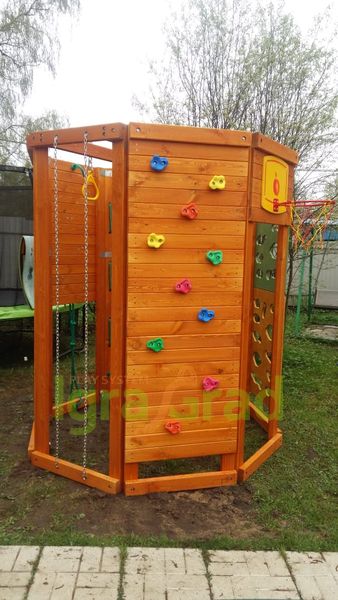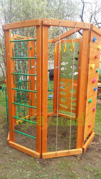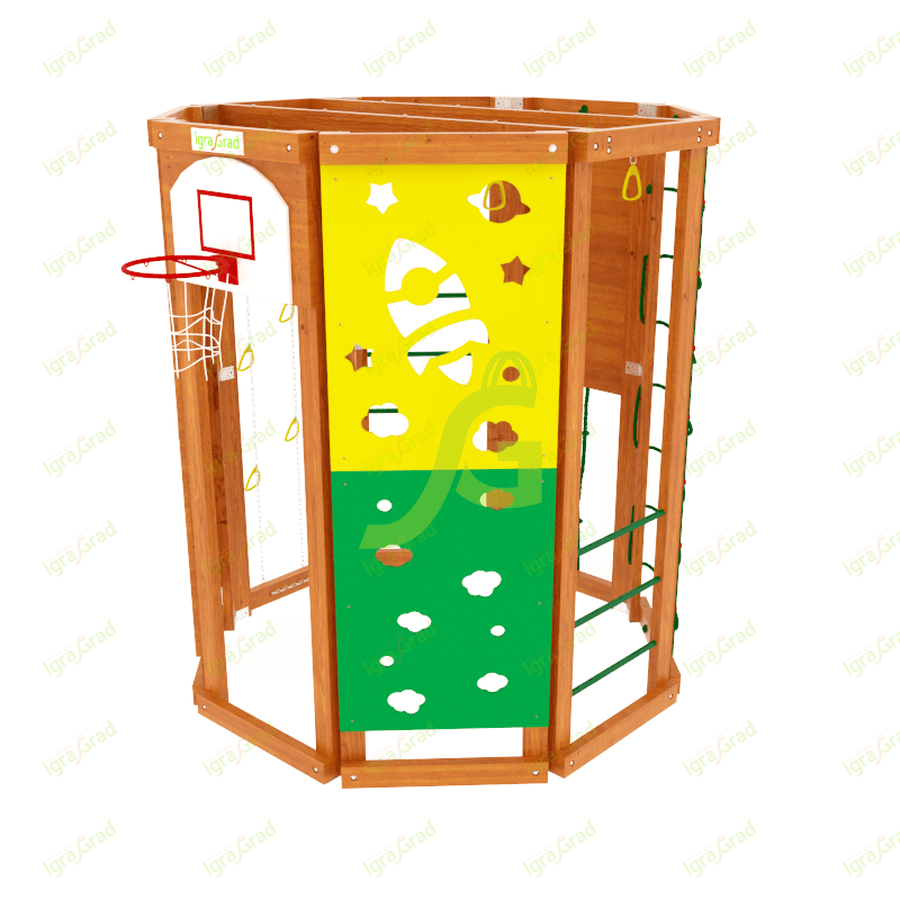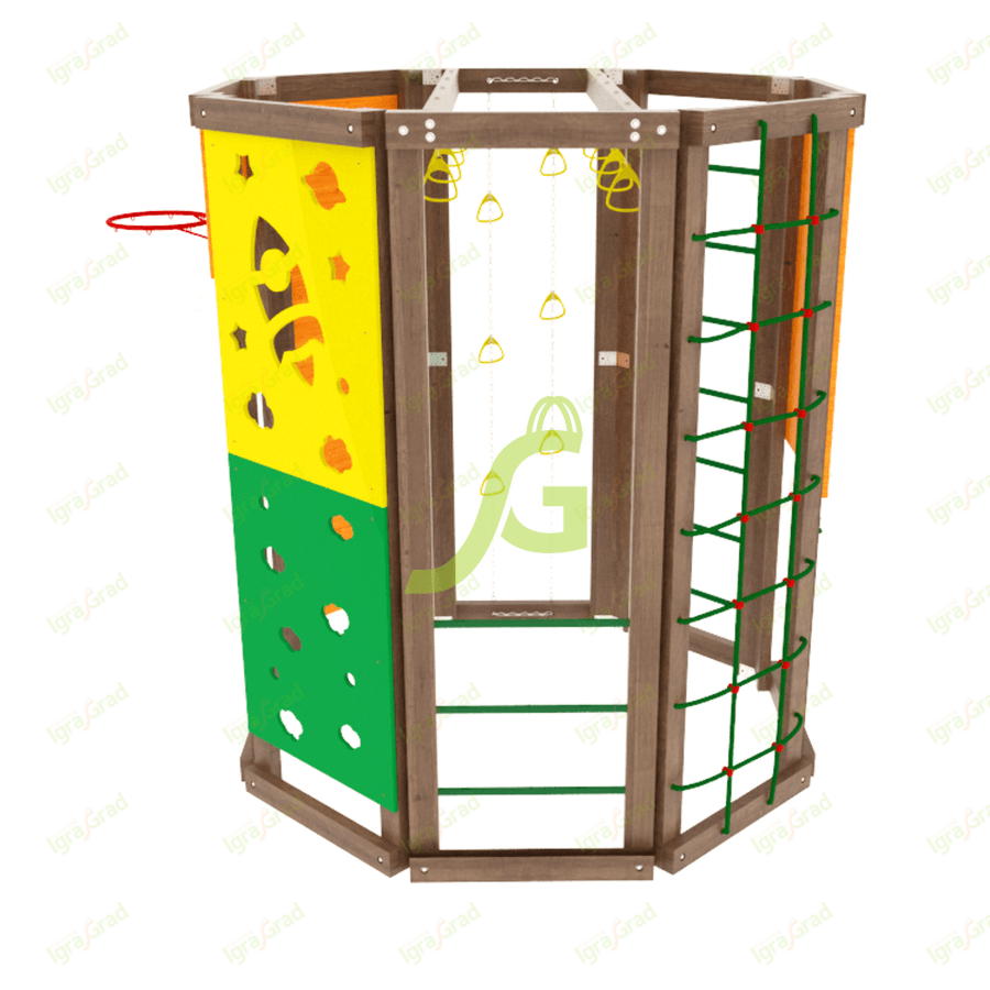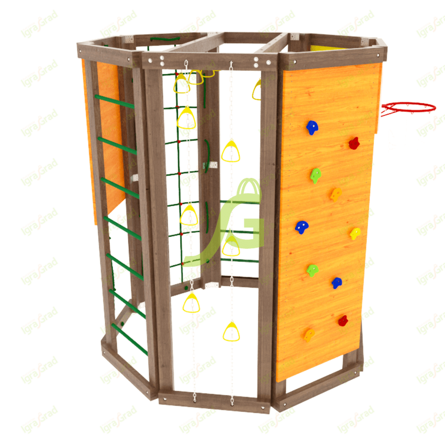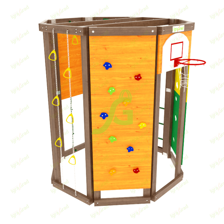Конструкция выполнена в виде многогранника, каждая стенка которого оборудована различными спортивно-игровыми элементами: «обезьяньей пропой», скалодромом, верёвочной лестницей, баскетбольным кольцом. Высота сооружения достигает 2,29 м, а ширина 1,99 м – оптимальные размеры для занятий двух-трёх человек..