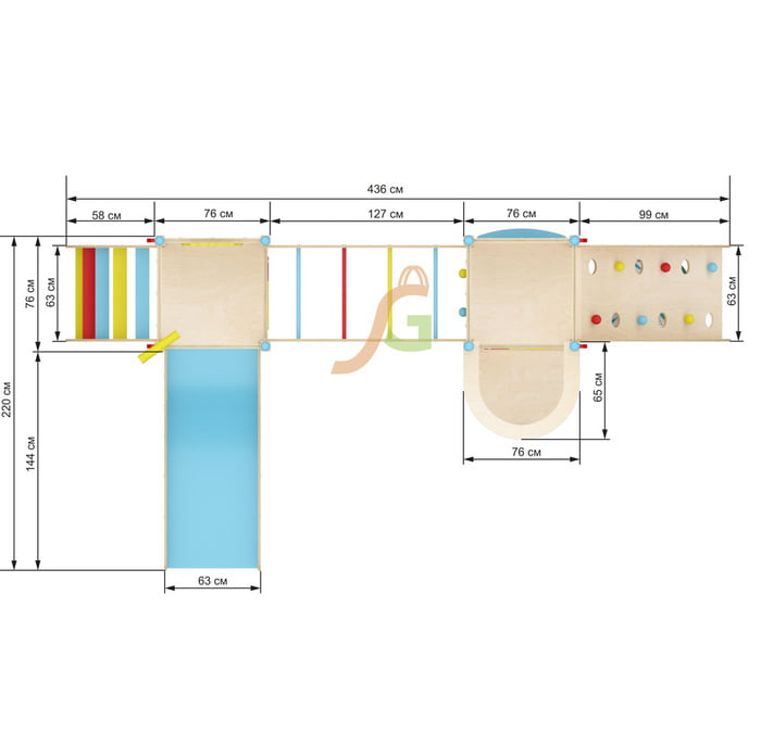 высокого элемента с 2-мя видами лестниц и спуском в виде шеста.