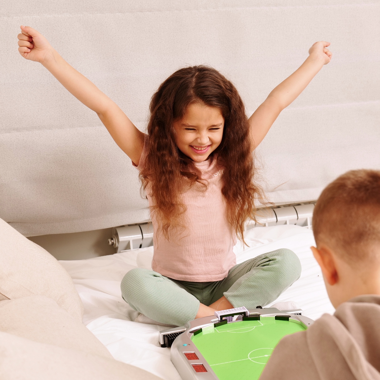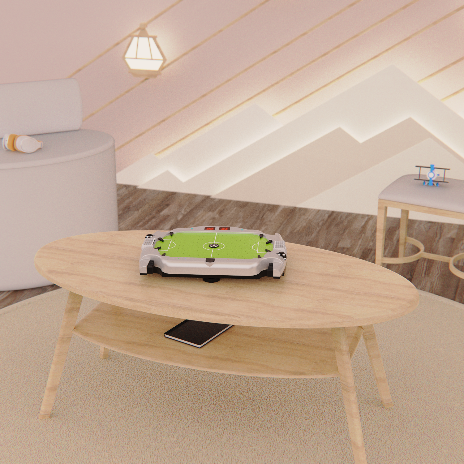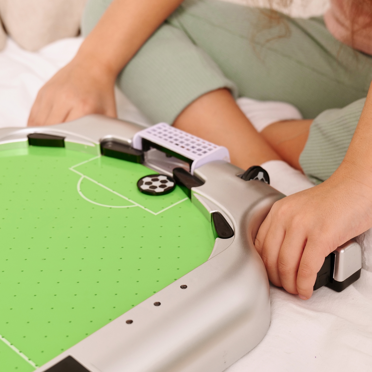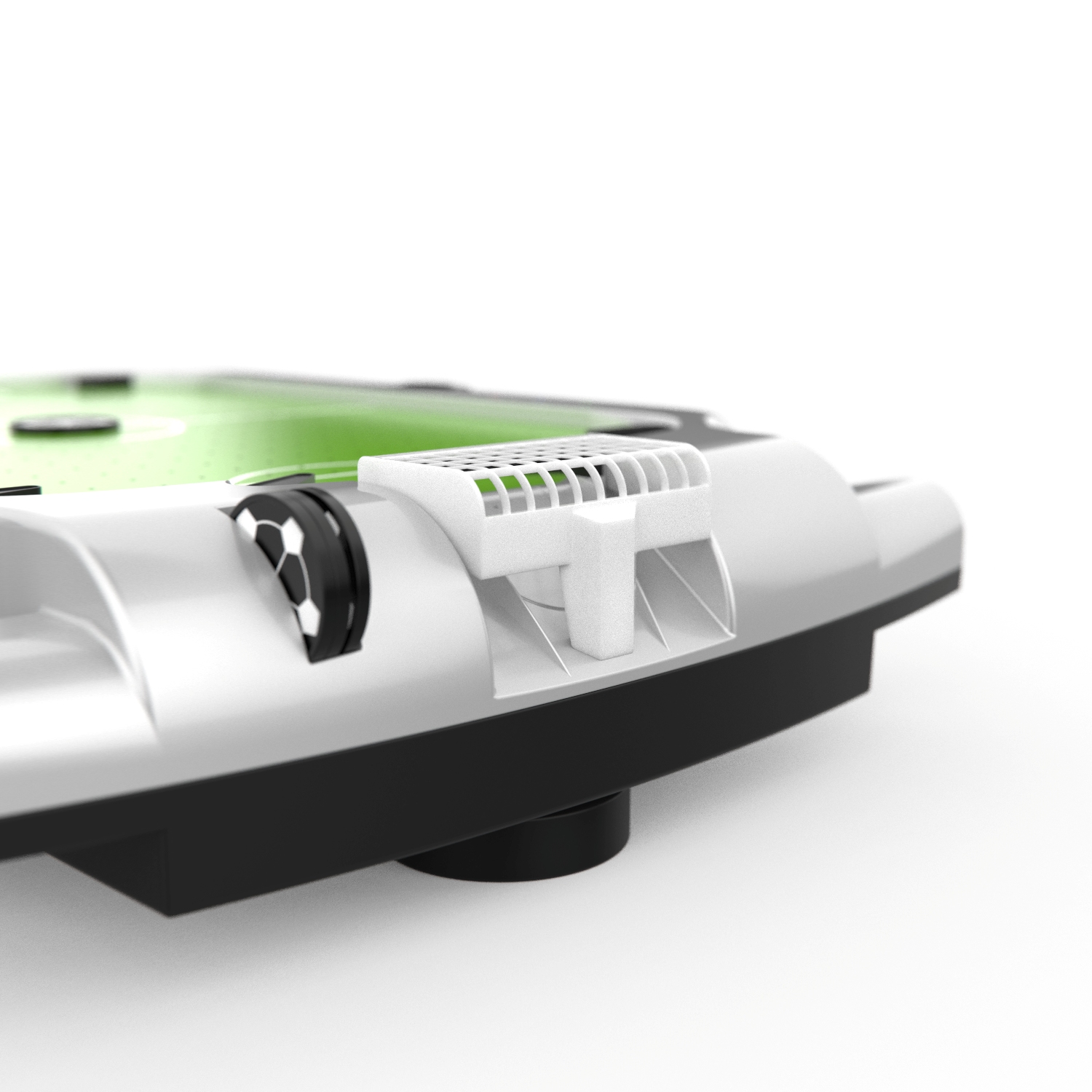 Игровое поле размерами 39,5 х 26,5 см из полипропилена покрыто ПВХ. Полипропилен более гладкий и прочный, в отличие от МДФ, благодаря чему шайбы отлично скользят по полю, а стол прослужит вам продолжительное время.