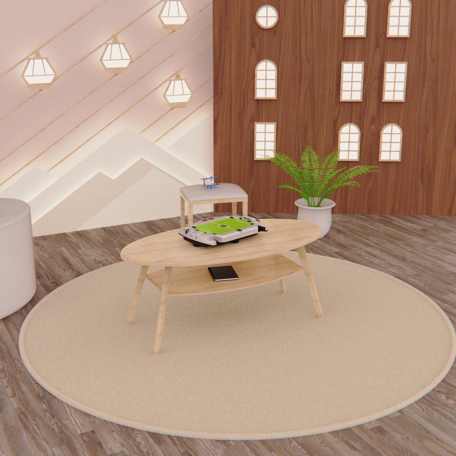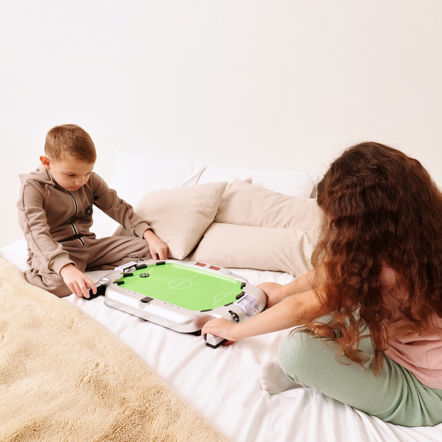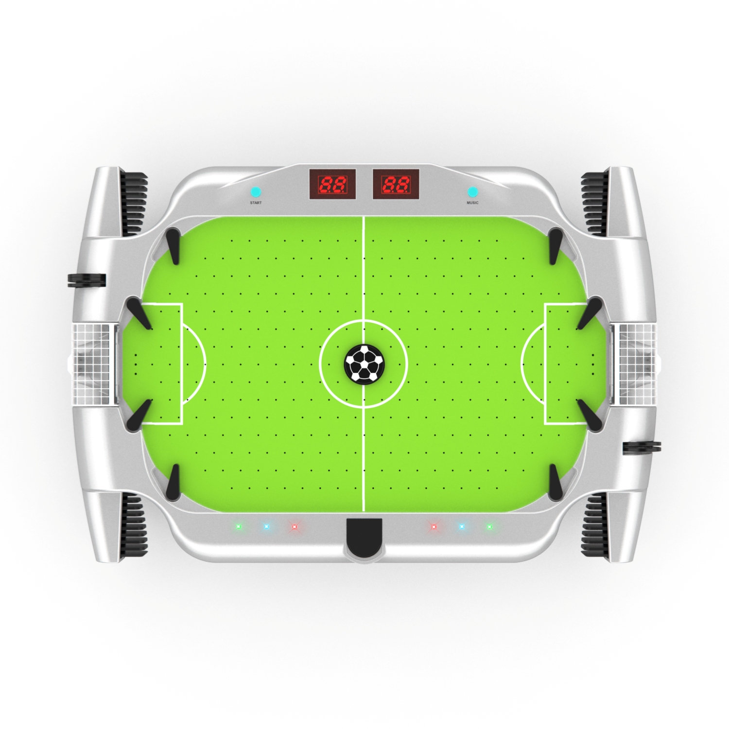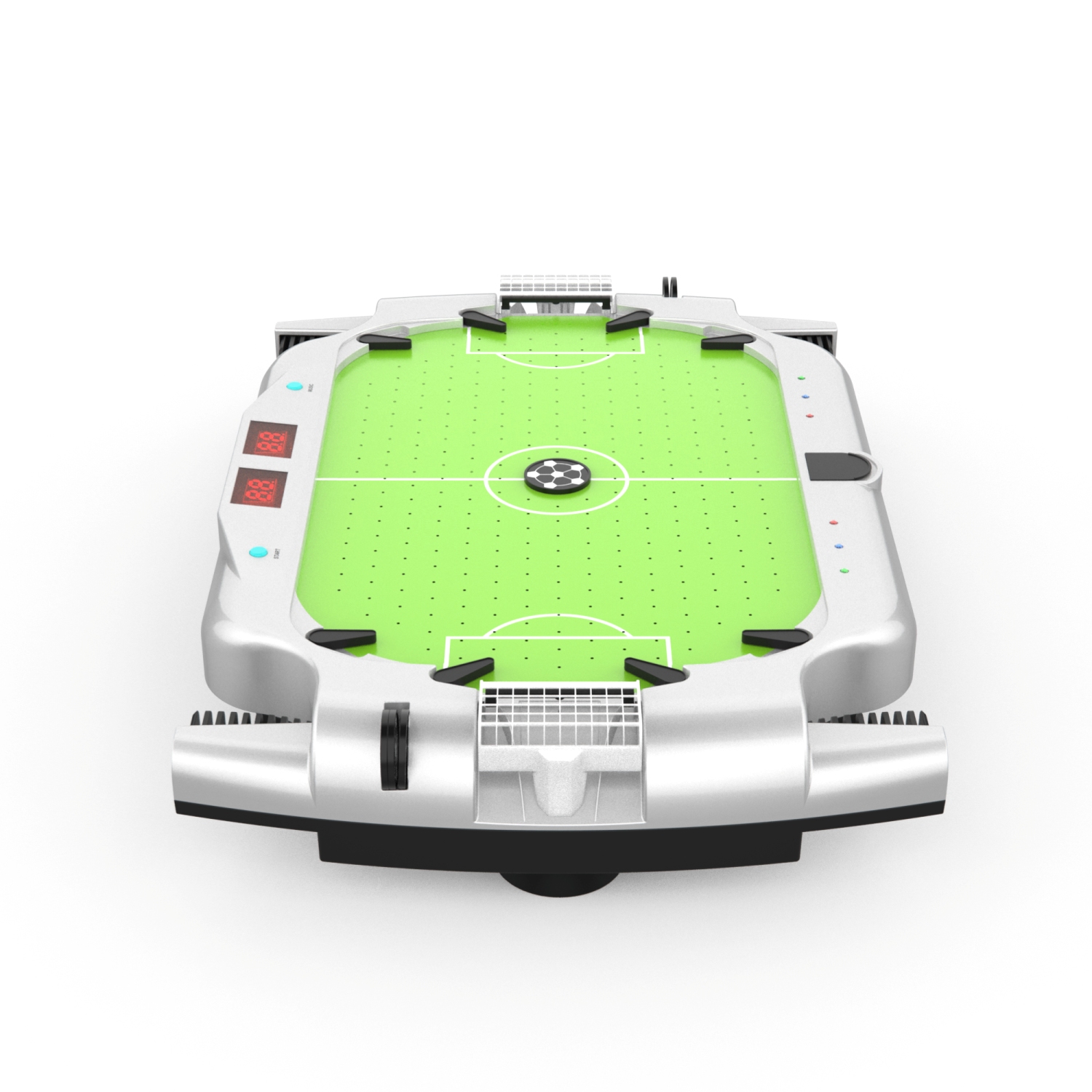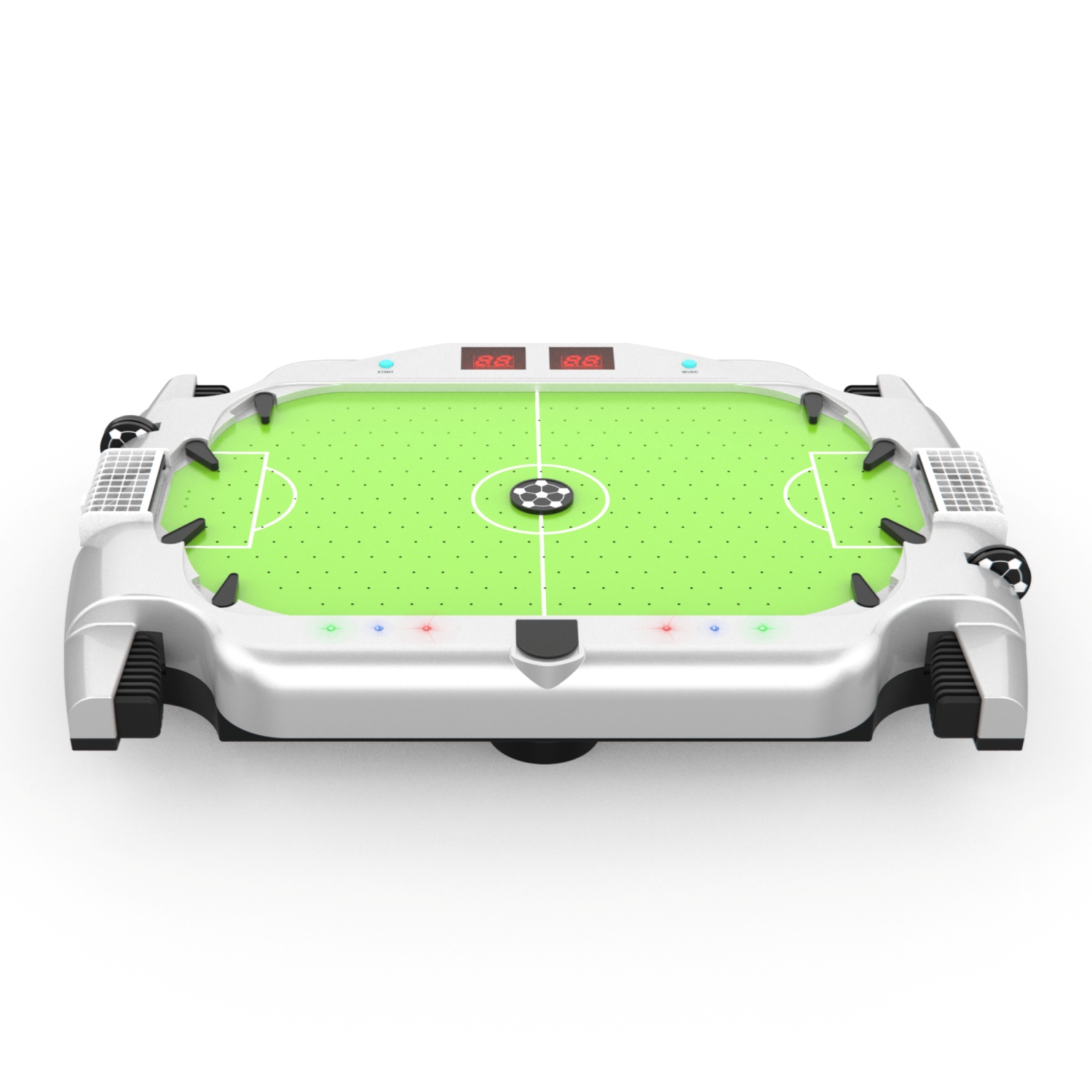 В комплект входят 6 шайб в виде футбольных мячей диаметром 30 мм, а также электронный счётчик голов - данная особенность отличает стол от модели SB-ST-2511.
