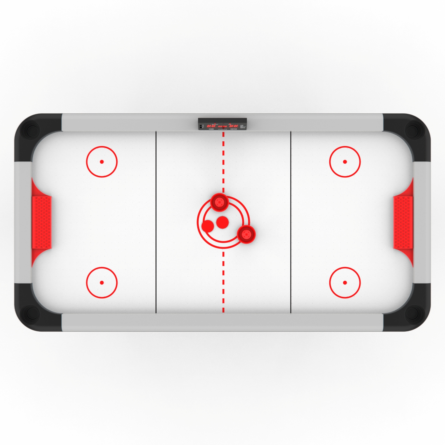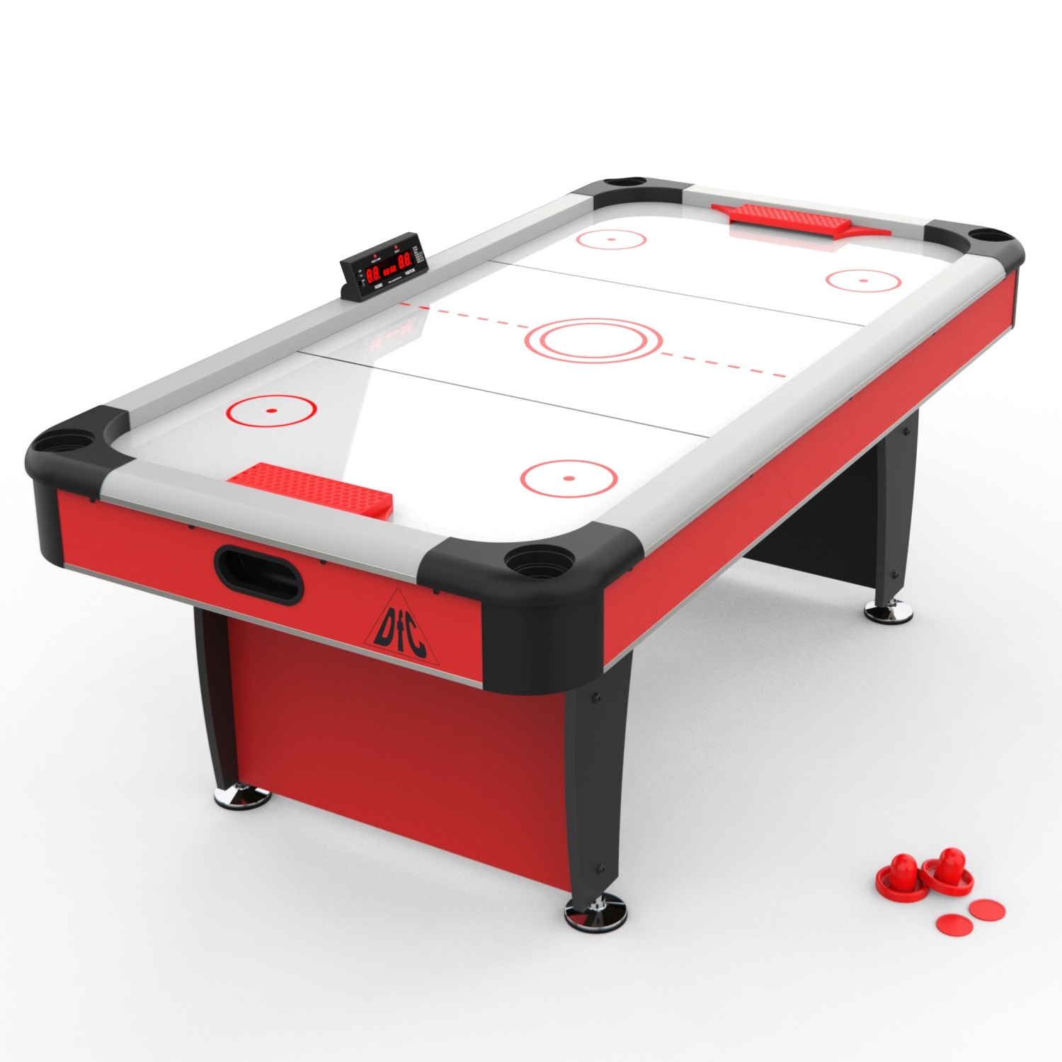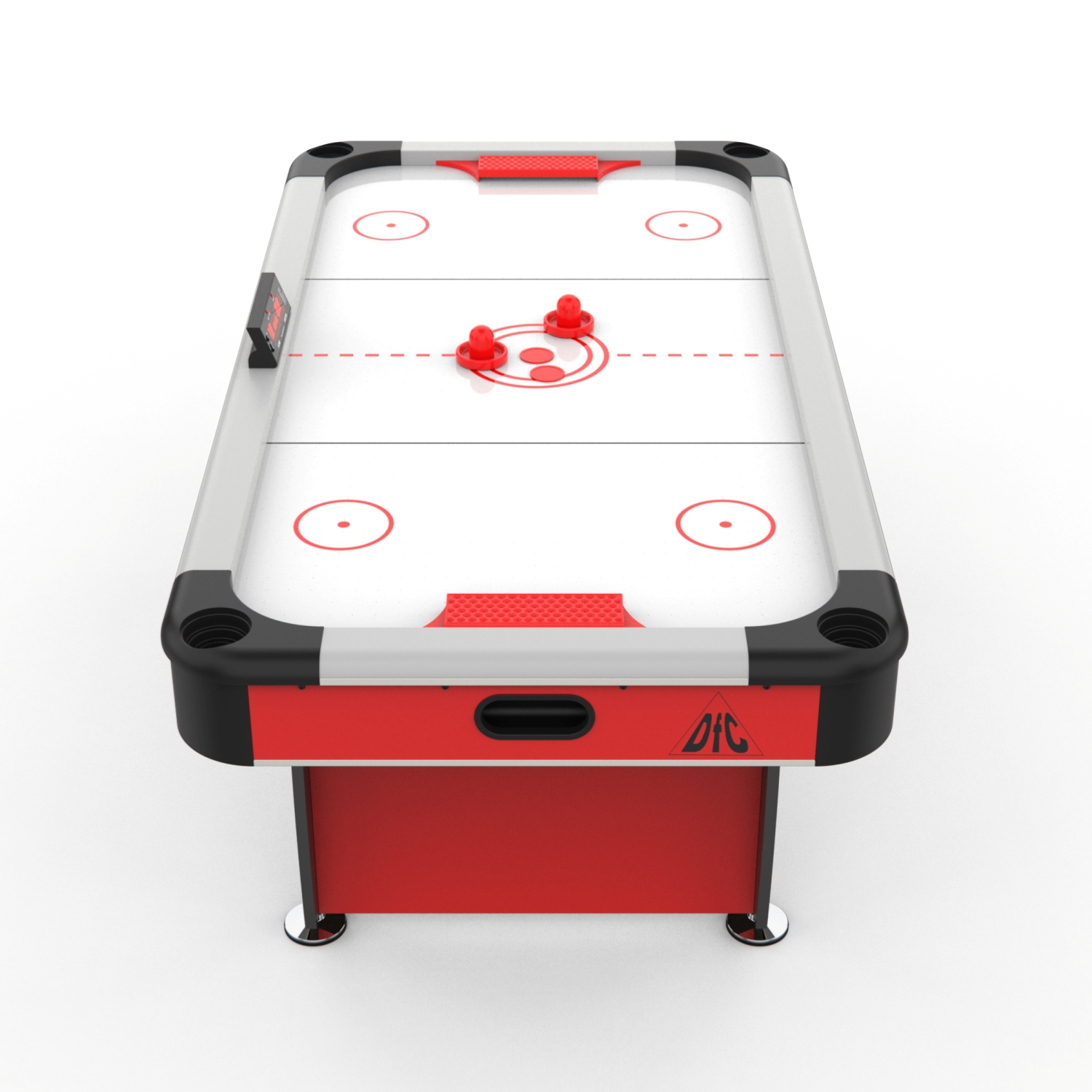 Стол оборудован электронным табло для подсчета очков. Корпус выполнен из специально обработанного МДФ толщиной 20 мм, сверху покрытого прочной пленкой из ПВХ. Мощный компрессор подает воздух через отверстия. Напряжение: 220В. По углам стола удобные карманы для хранения бит и шайб.