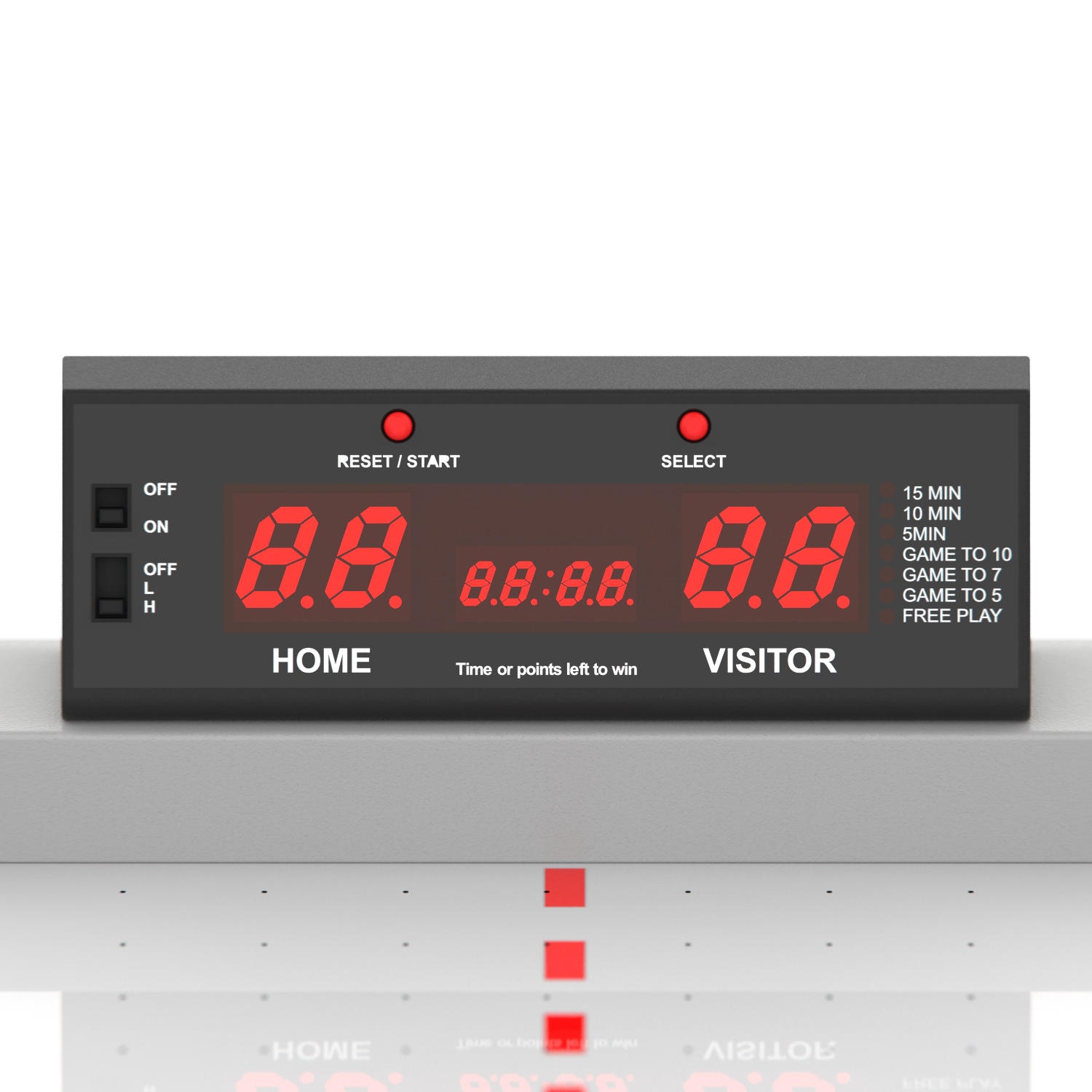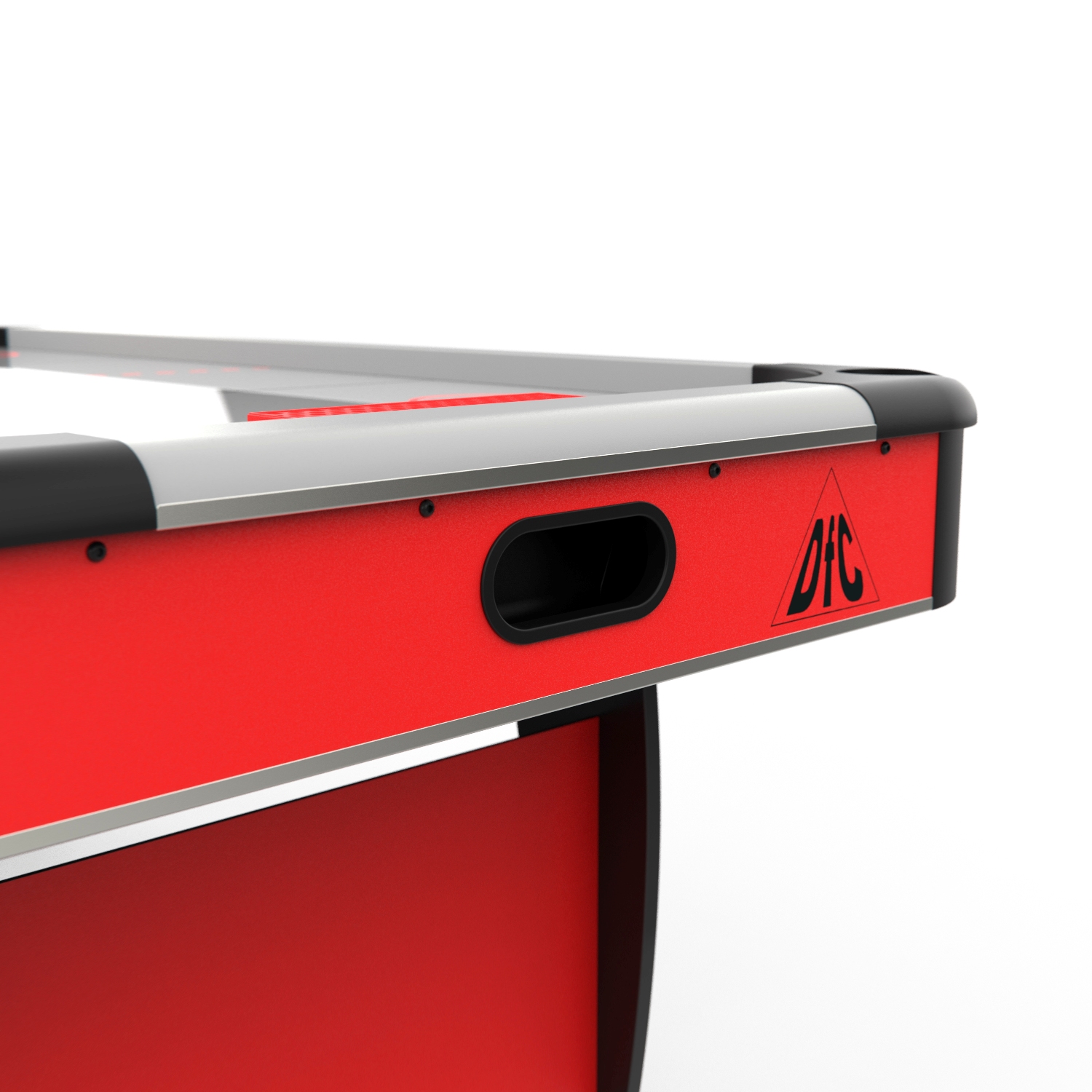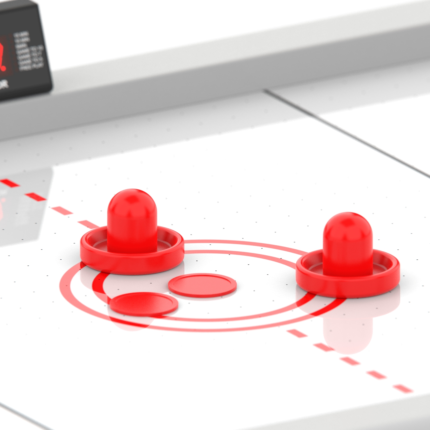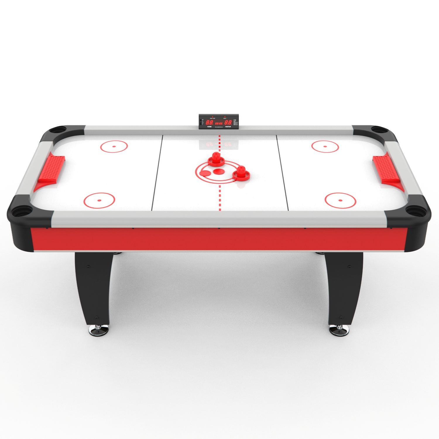 Стол оборудован электронным табло для подсчета очков. Корпус выполнен из специально обработанного МДФ толщиной 20 мм, сверху покрытого прочной пленкой из ПВХ. Мощный компрессор подает воздух через отверстия. Напряжение: 220В. По углам стола удобные карманы для хранения бит и шайб.