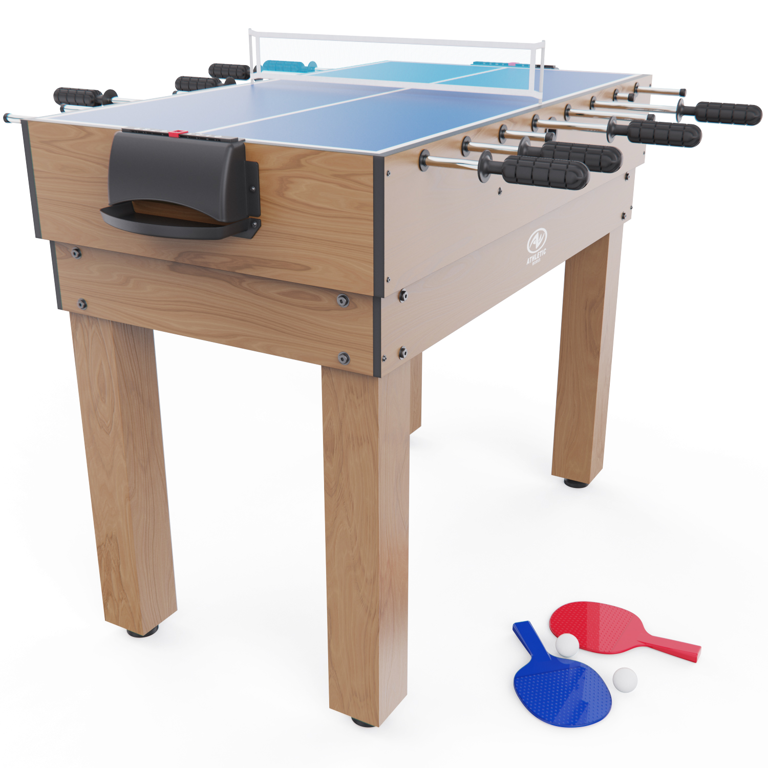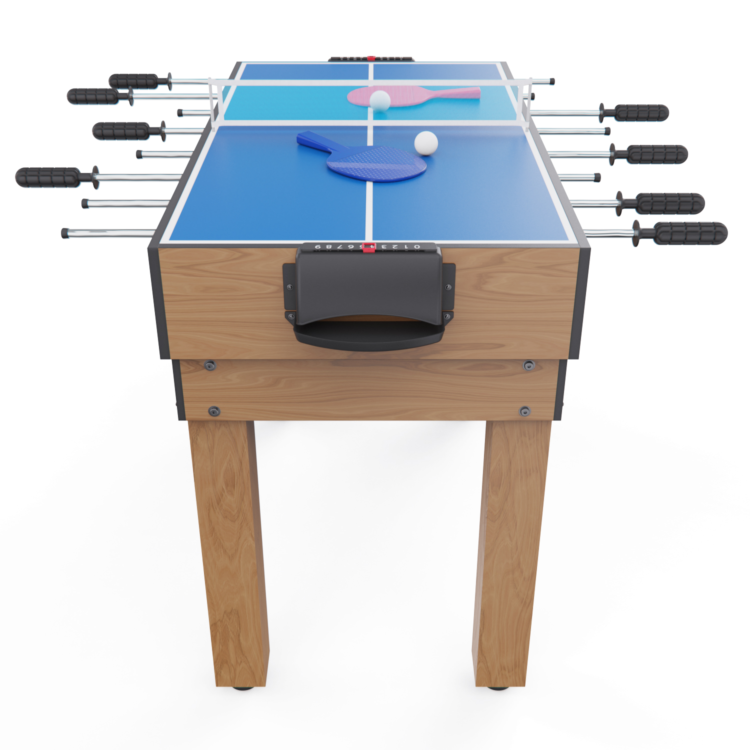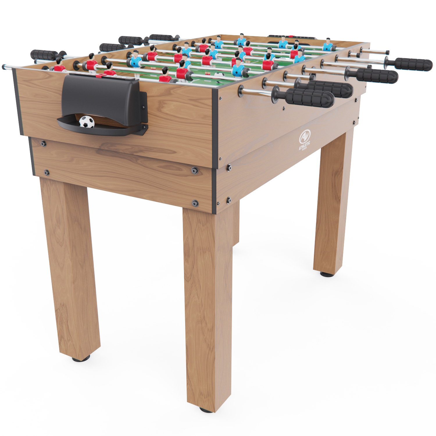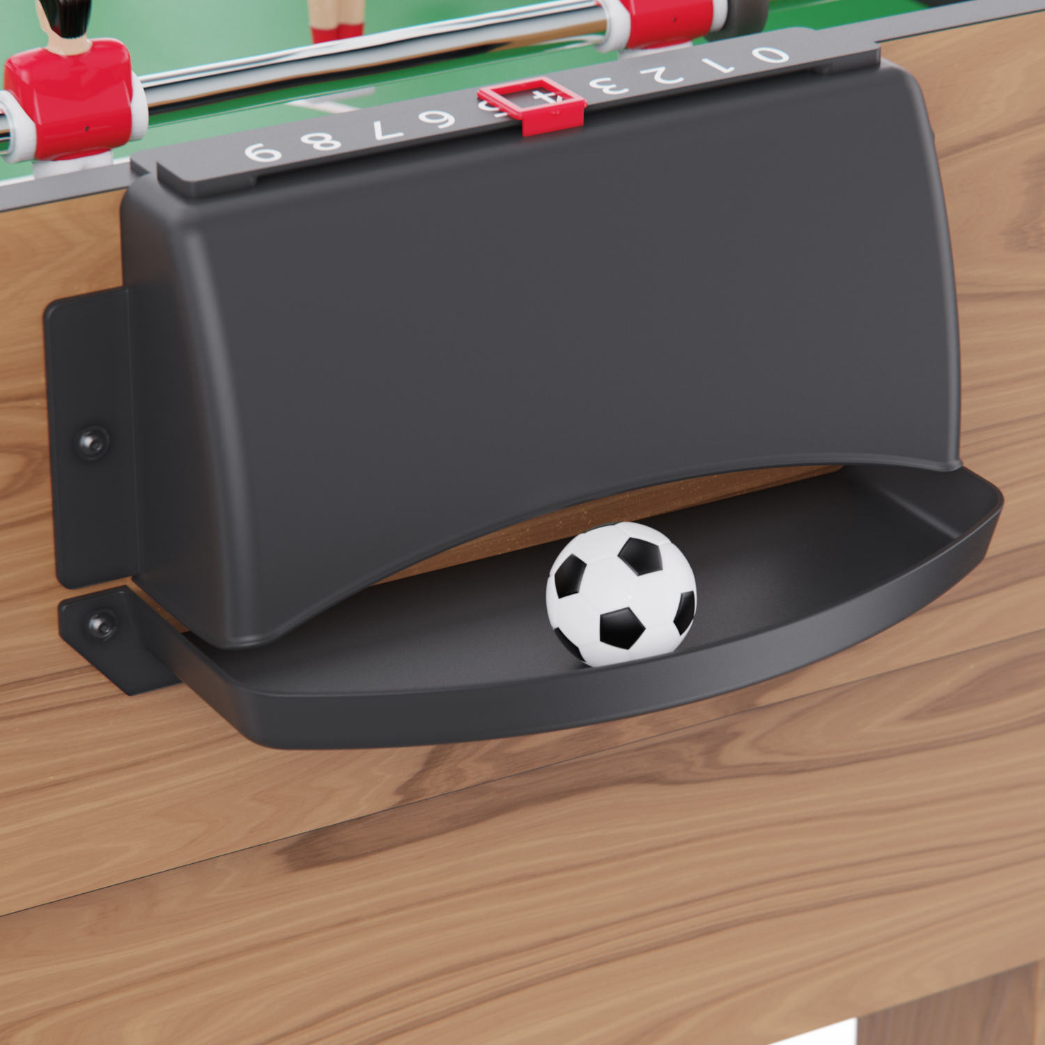 Габариты стола — 124 х 61 х 81 см, высота ножек — 61 см. Стол выполнен из прочных материалов (МДФ и ПВХ), обеспечивающих надежность и устойчивость конструкции. Толщина игрового поля — 3 мм, а бортиков — 12 мм, что гарантирует долговечность и комфорт в игре.