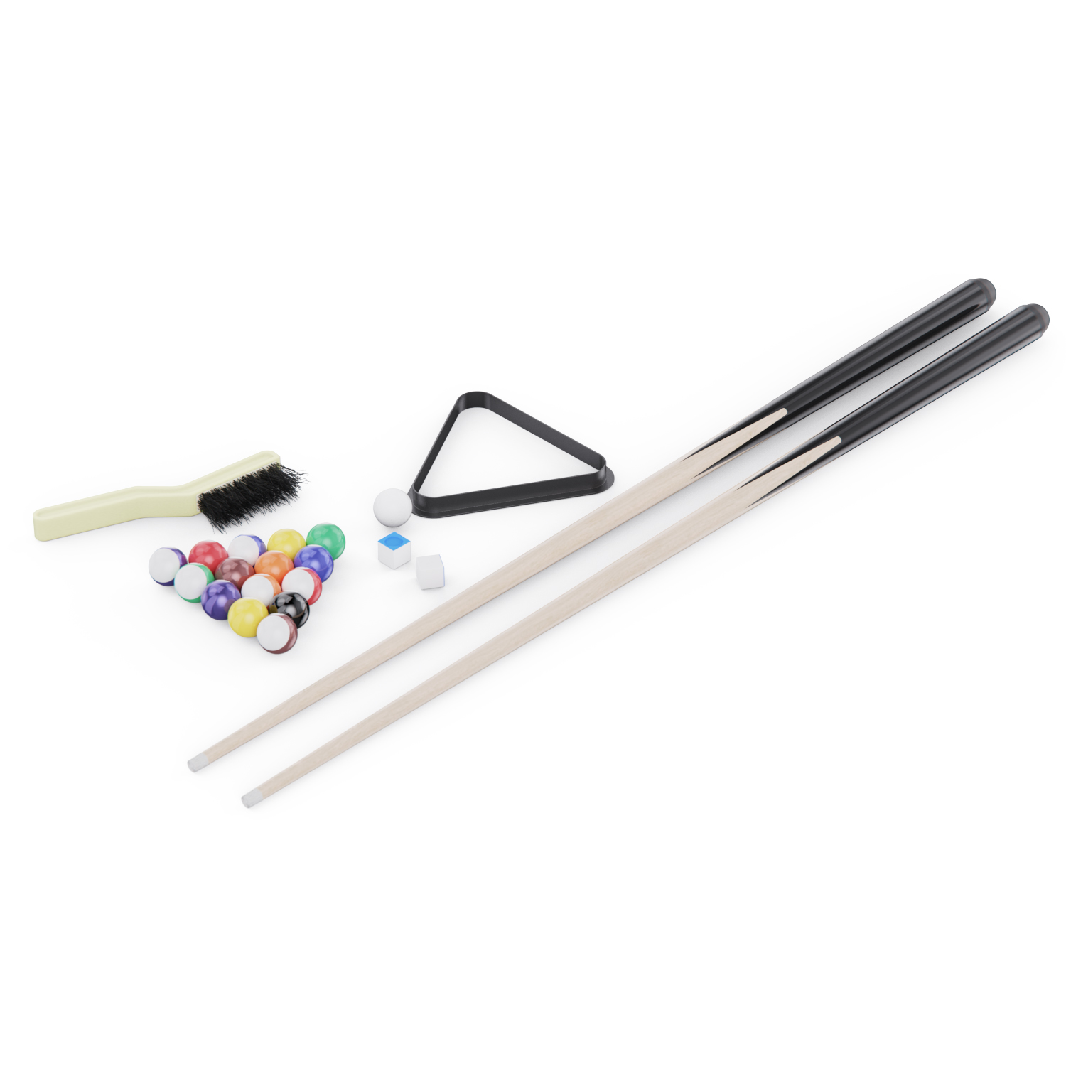 В набор входят: 2 футбольных мячика, 2 теннисные ракетки, 2 мяча для настольного тенниса, комплект бильярдных шаров, треугольник для их