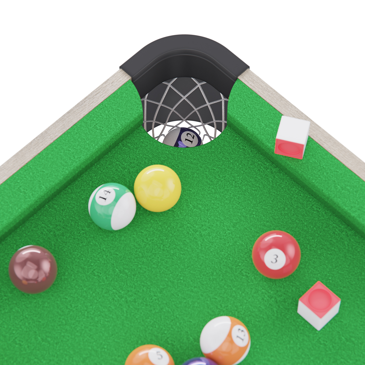 Диаметр шара — 38 мм, длина кия — 107 см, диаметр луз — 70 мм. Все элементы выполнены с точным соблюдением пропорций, что делает игру максимально приближенной к профессиональной.