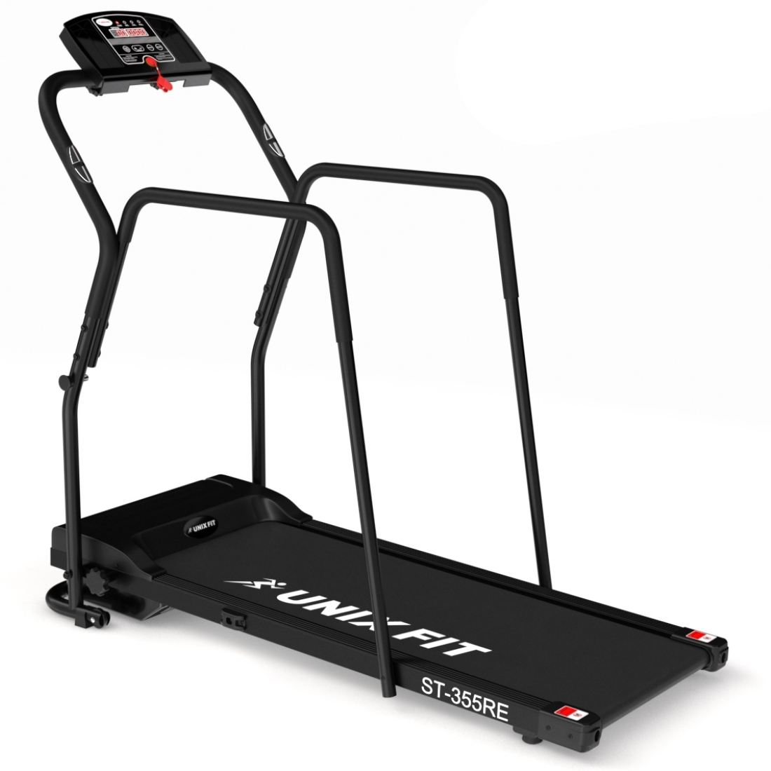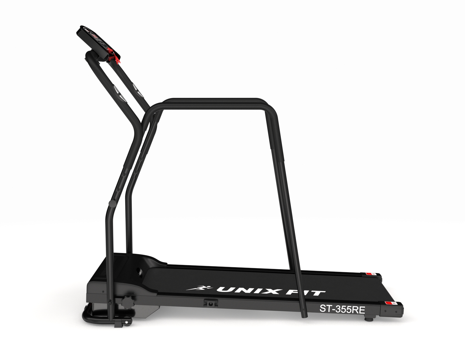 UNIXFIT ST-355RE отличается легкостью и компактностью. К отличительным особенностям следует отнести комфортную для ходьбы и бега ширину бегового полотна, прочную раму и встроенные в поручни датчики измерения пульса. Максимальная скорость 10 км/ч соответствует бегу в среднем и быстром темпе, что позволяет проводить полноценные тренировки пользователям с высоким уровнем физической подготовки.