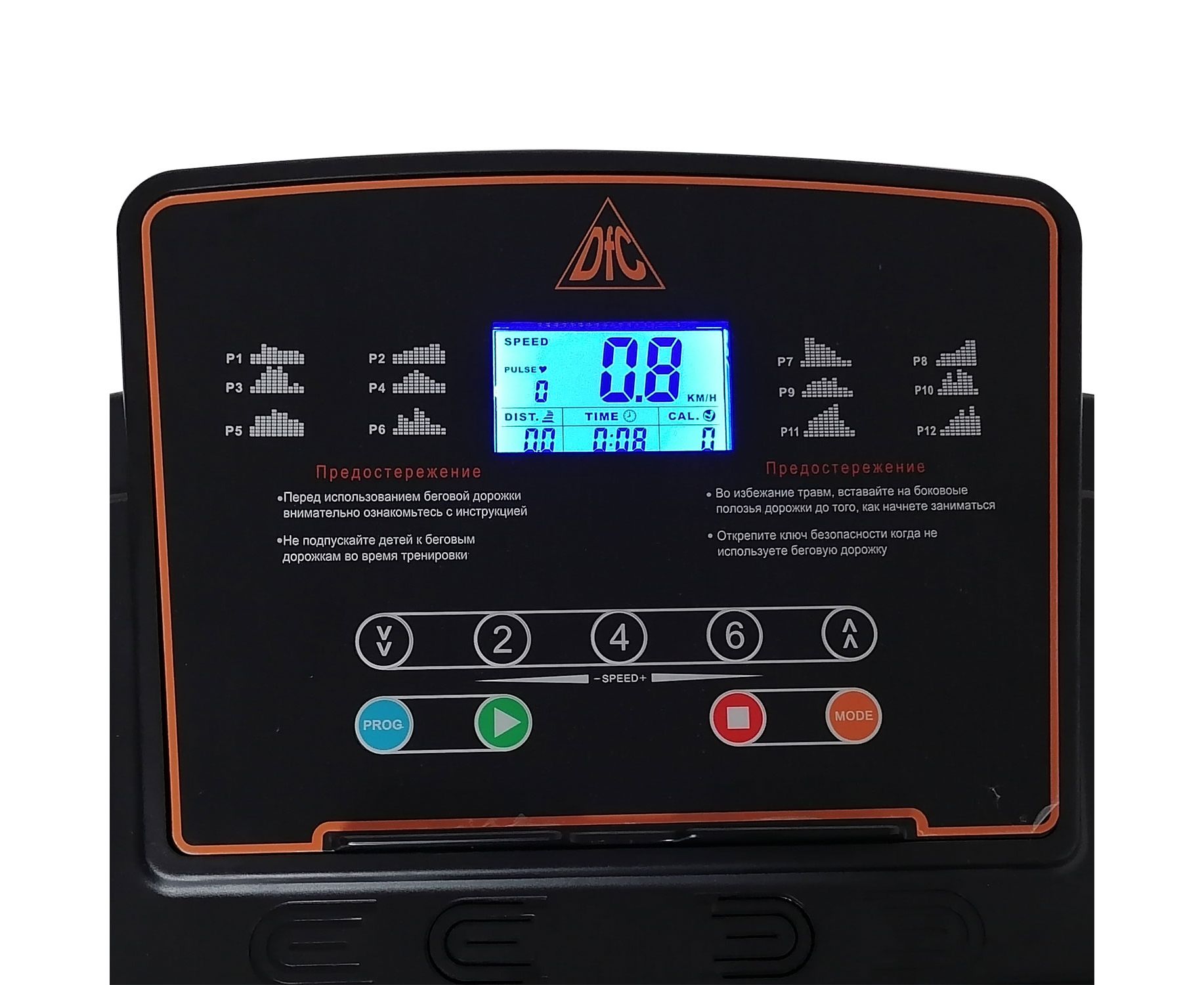 Консоль беговой дорожки оснащена LCD-дисплеем с голубой подсветкой, отображает всю необходимую пользователю информацию во время тренировки: скорость, время, дистанция, сжигаемые калории, пульс.