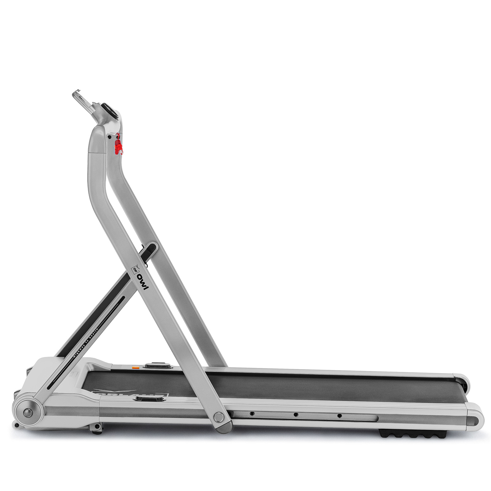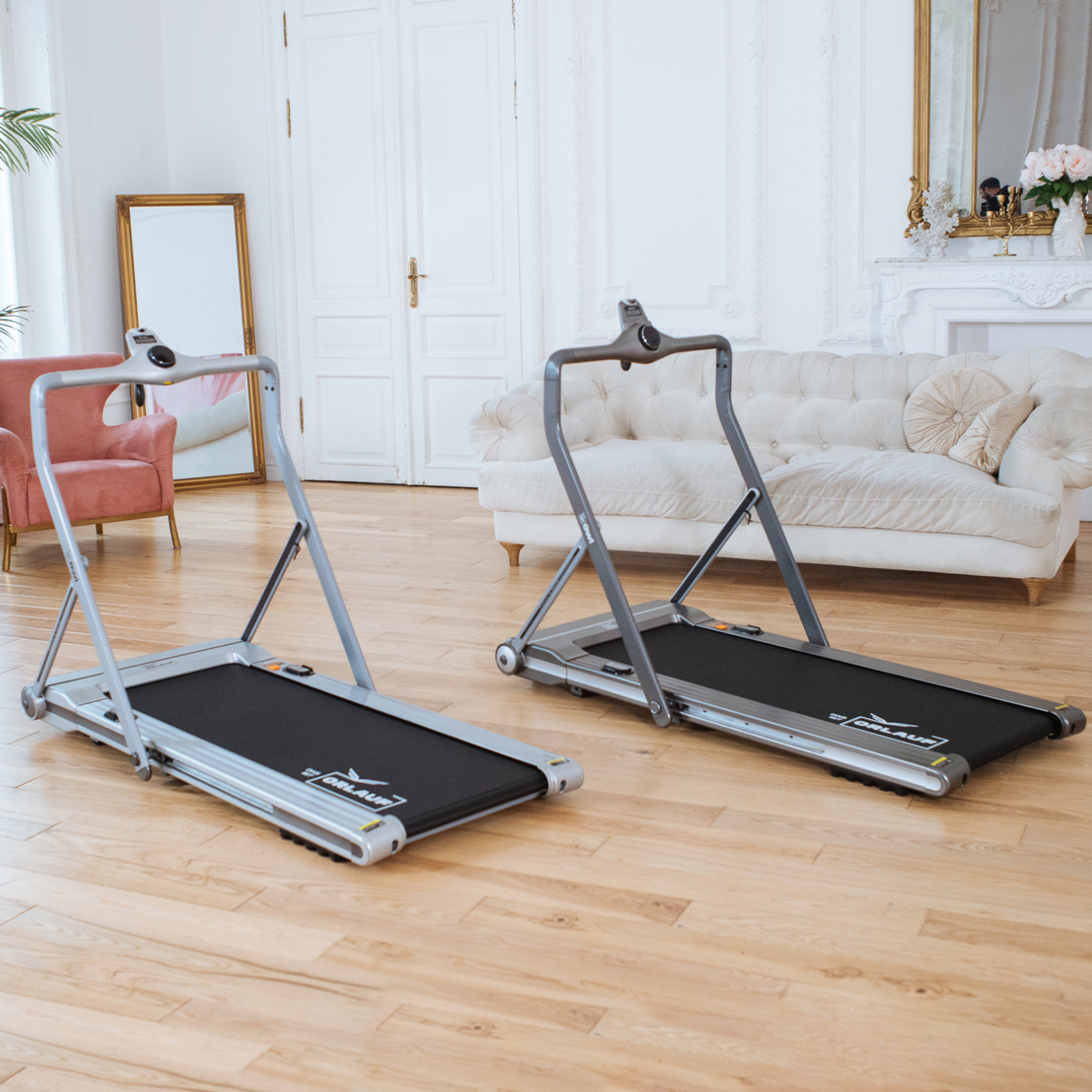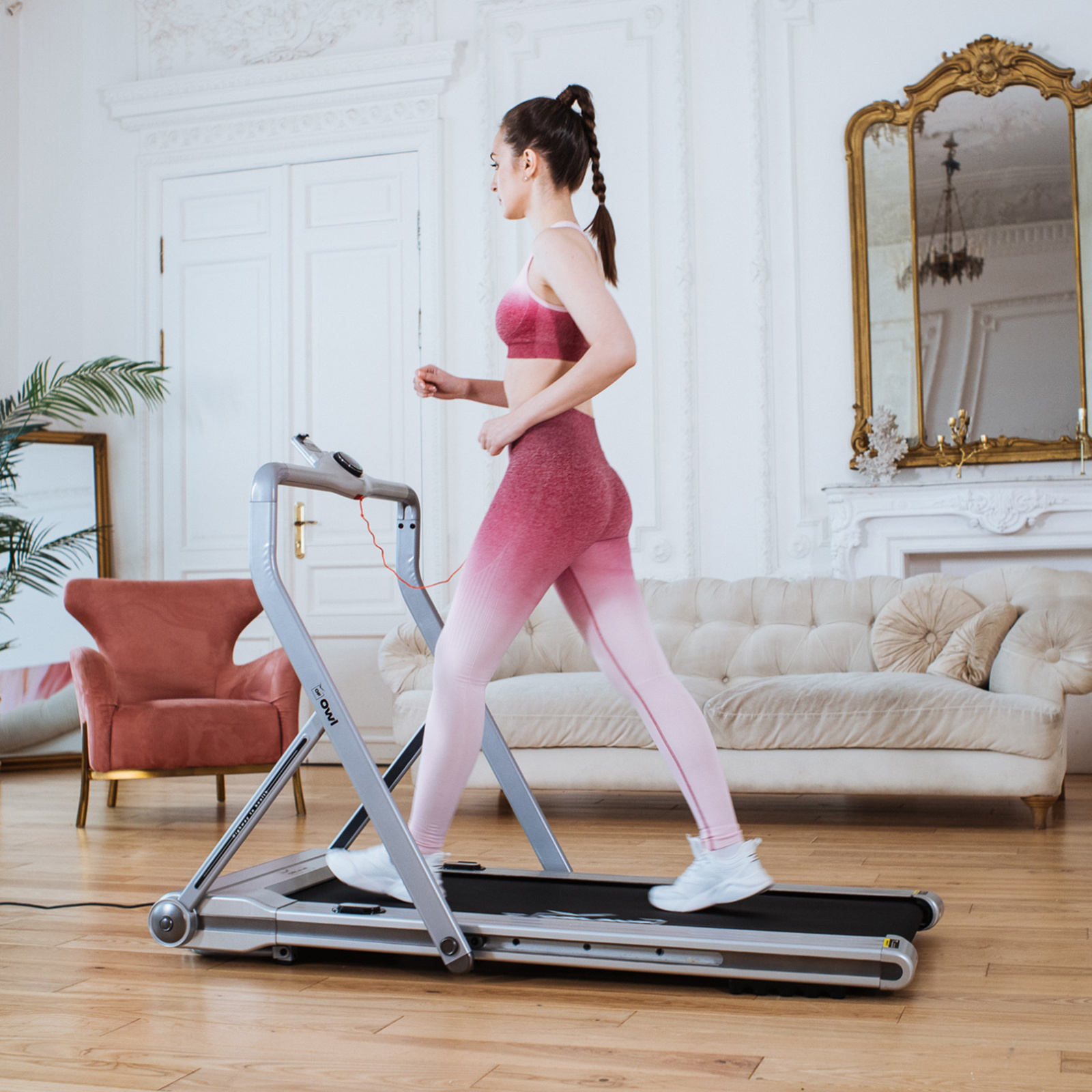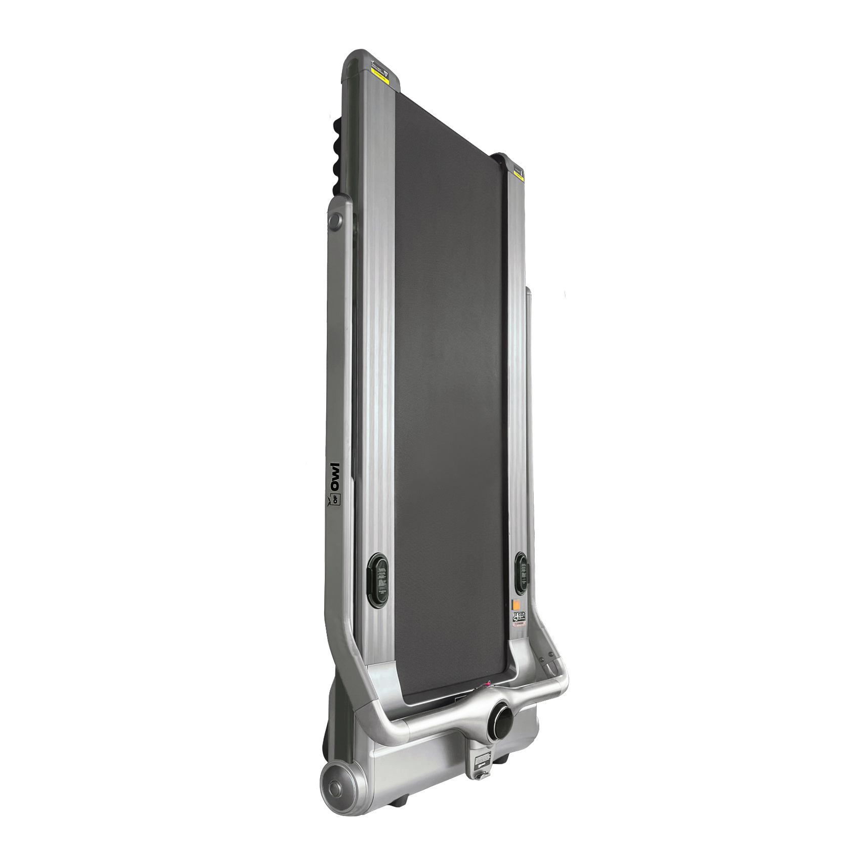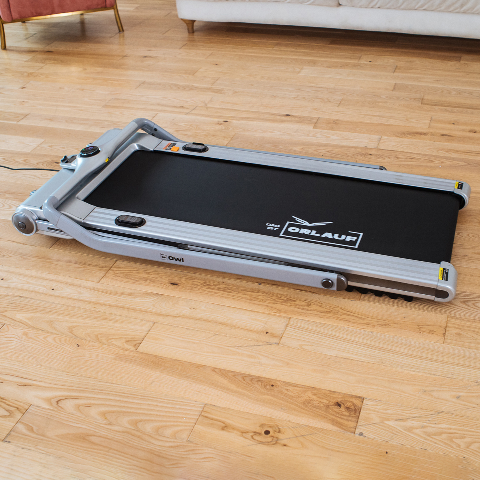 В сложенном виде толщина Owl всего 21 см, это один из самых компактных показателей. Сложенную дорожку можно хранить как горизонтально, так и вертикально.Подножка автоматически выдвигается, когда вы ставите дорожку вертикально. И автоматически подгибается, когда опускаете тренажер на пол.