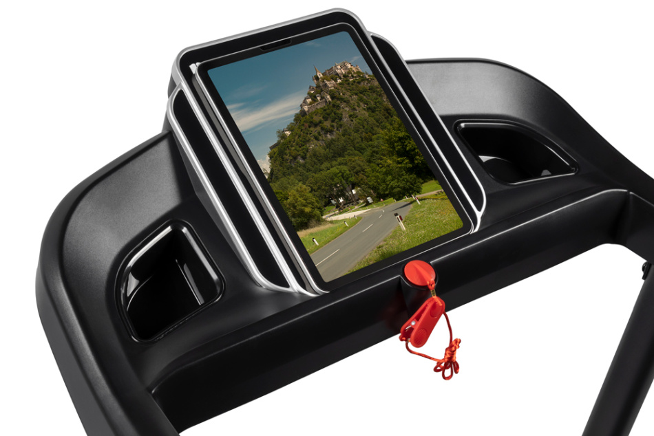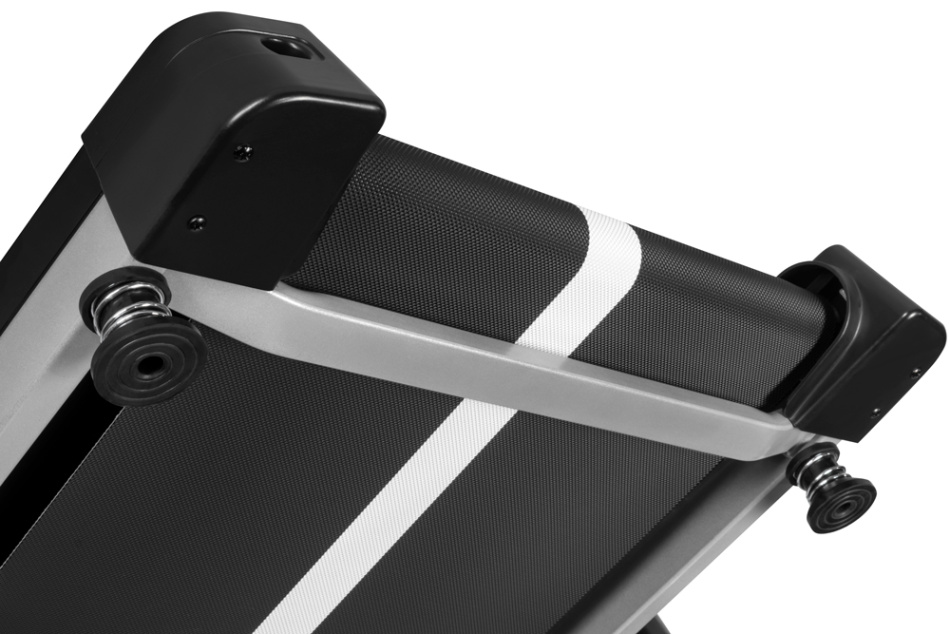 На поручнях расположены сенсорные датчики пульса. Перемещение дорожки происходит за счет 2-ух транспортировочных роликов.