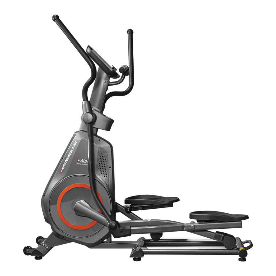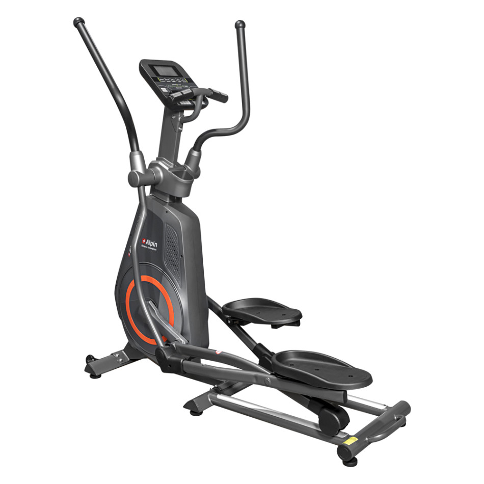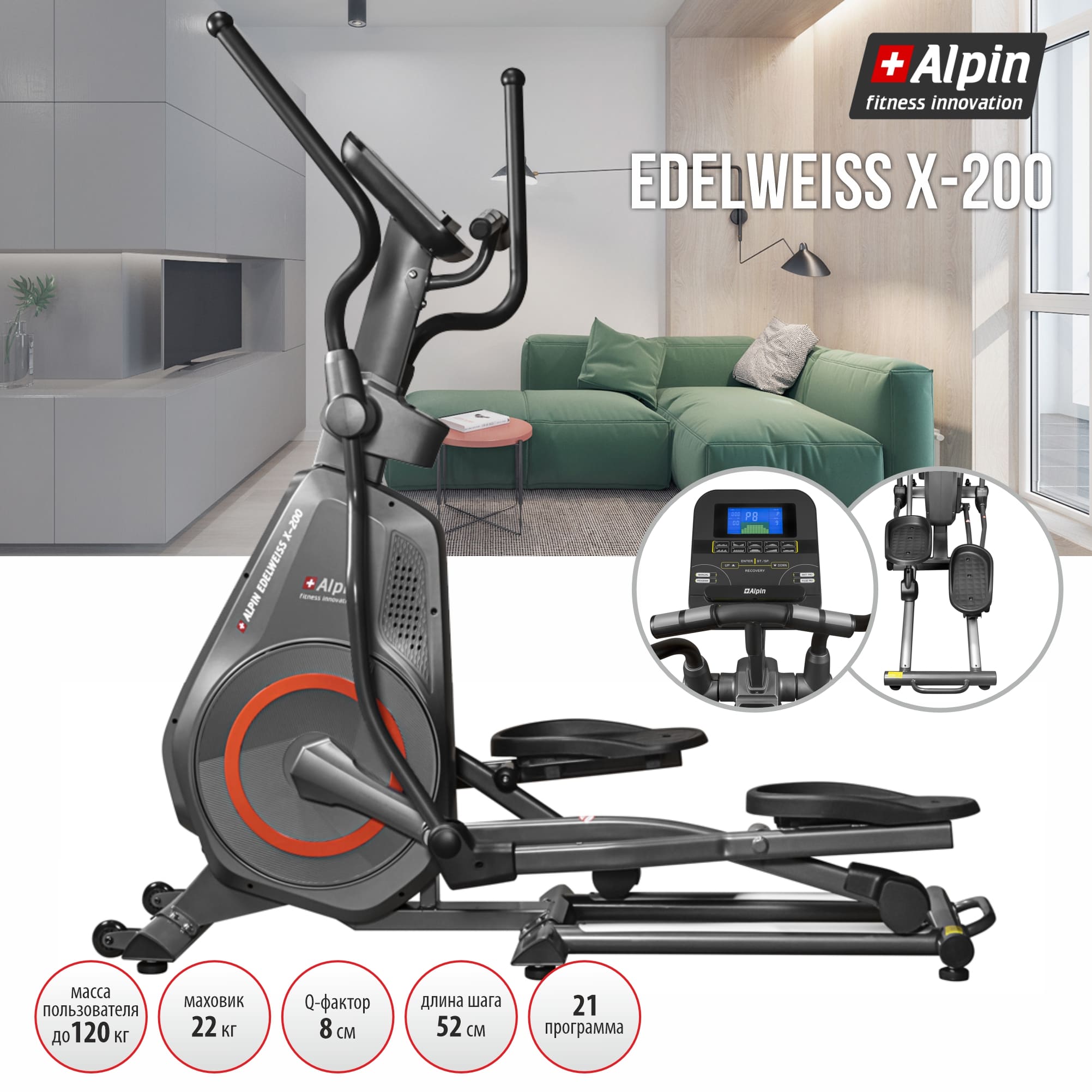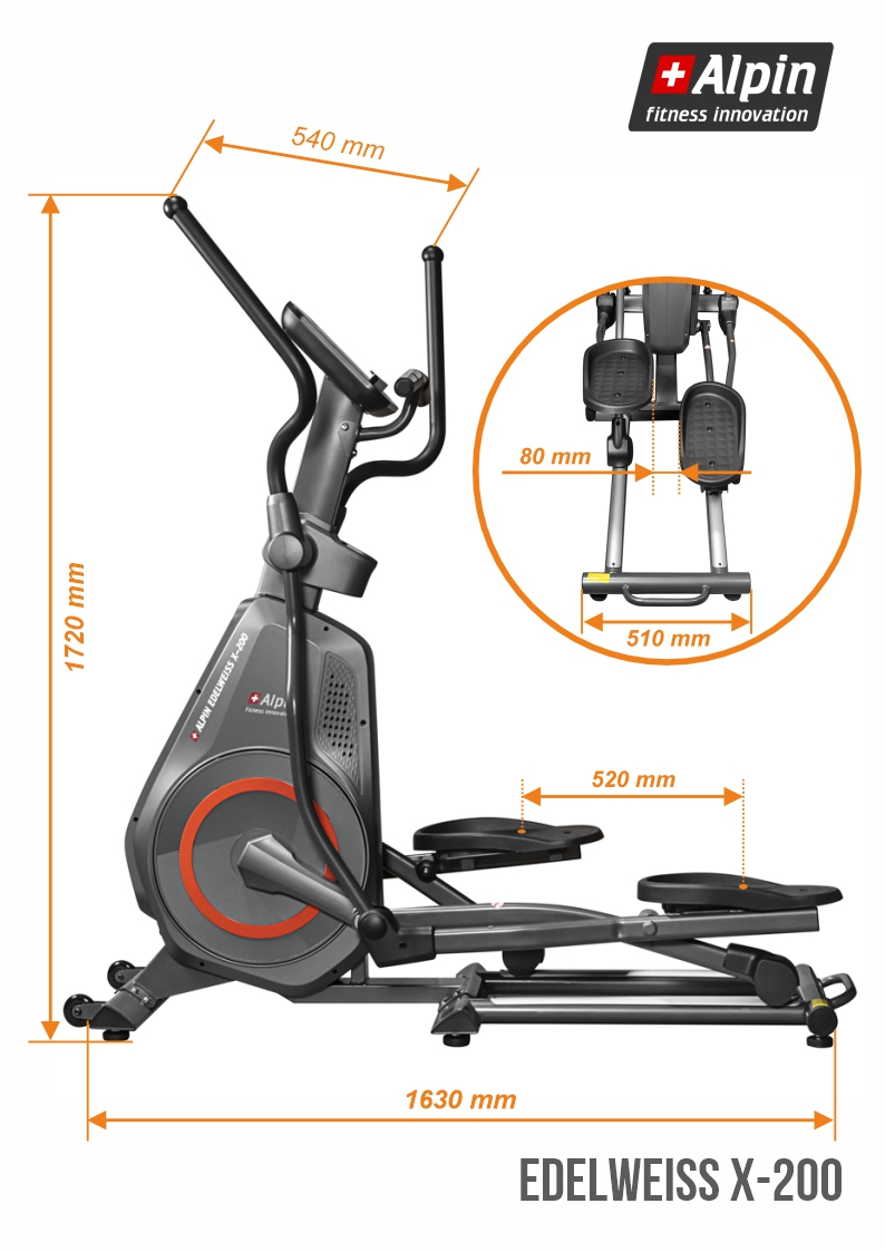 Alpin Edelweiss X-200 эллиптический тренажер с переднерасположенным маховиком. Такая конструкция является самой современной и перспективной разработкой в биомеханике эллипсоидов. Передний маховик позволяет значительно лучше смоделировать общую траекторию движения, уменьшить расстояние между педалями и добиться увеличения длины шага. В конечном счете, пользователь получает действительно эффективную и щадящую для суставов тренировку. Приводная система состоит из утяжеленного сбалансированного маховика инерционной массой 22 кг., трехкомпонентного дискового педального узла с реверсивным ходом, многожильного ремня и преднатяжителя, а также трех высококачественных подшипников. Длина шага составляет 520 мм. - это одно из максимальных значений в тренажерах такого типа. Конструкция тренажера выдерживает пользователя весом до 120 кг. Тренировочный компьютер представлен многофункциональным цветным LCD дисплеем размером 5.5 дюйма. В программный пакет входят 10 предустановленных программ, направленных на тренир