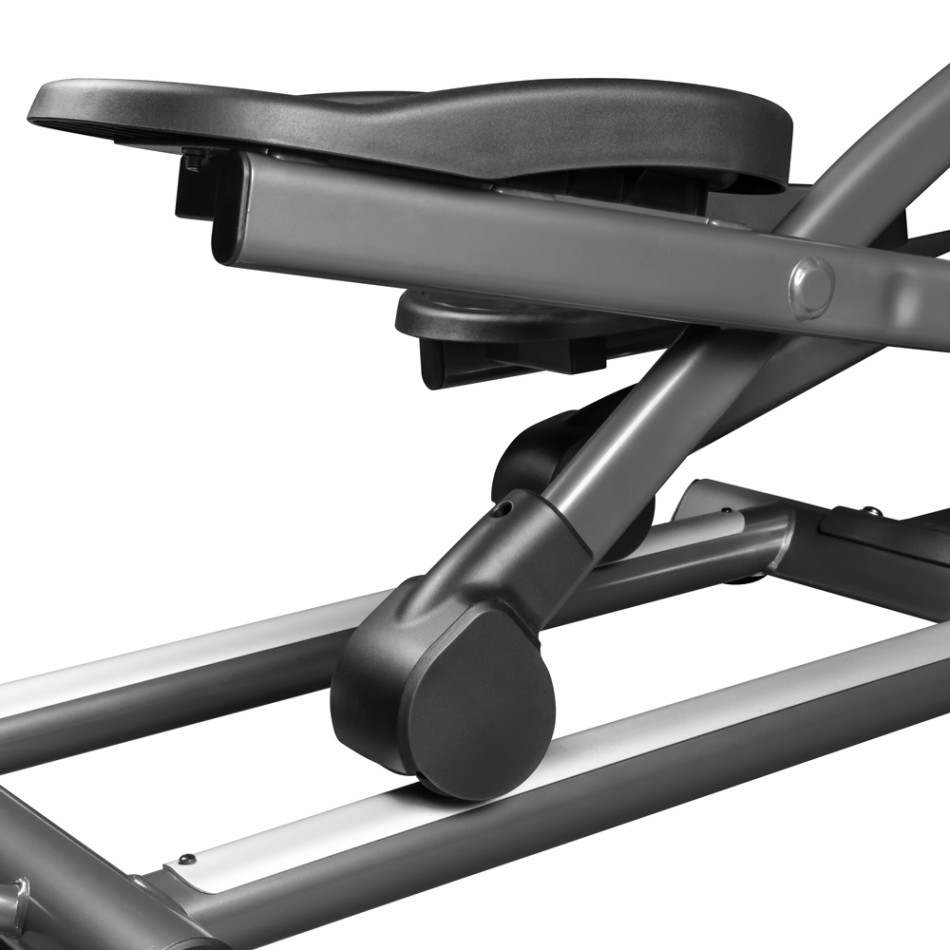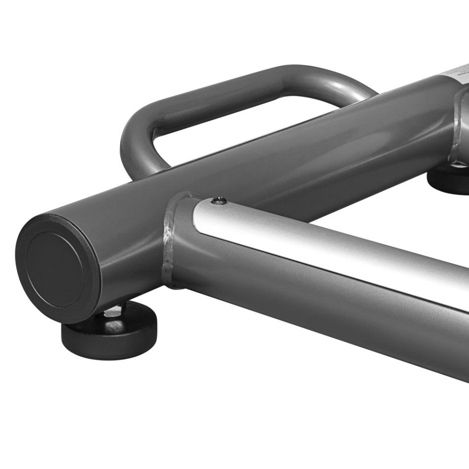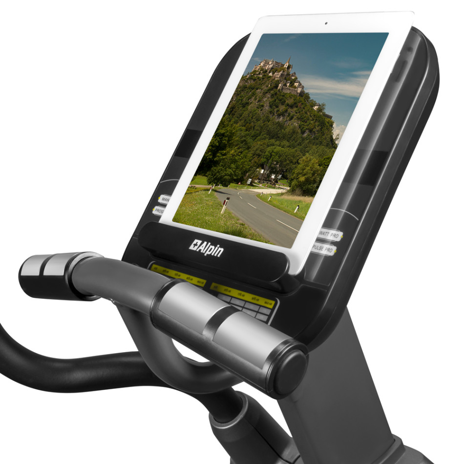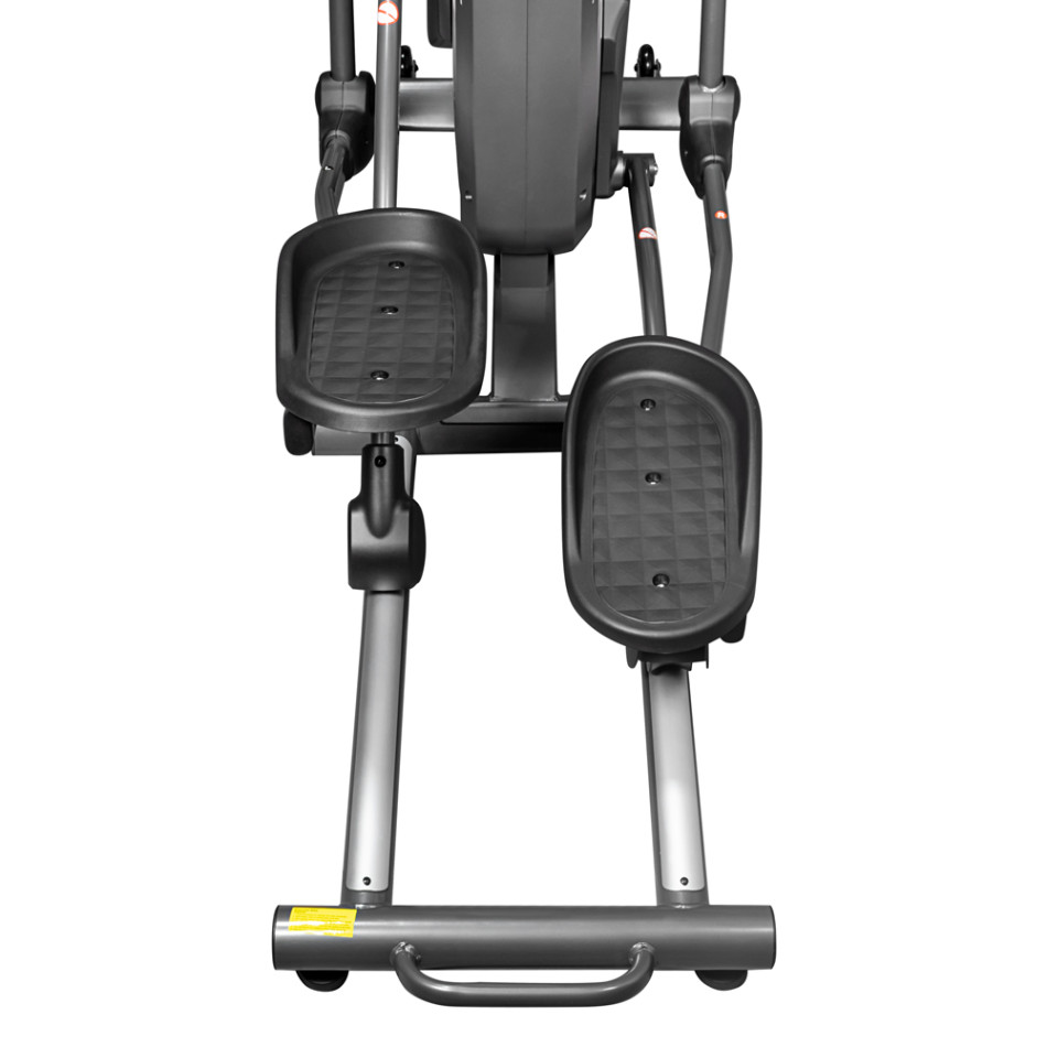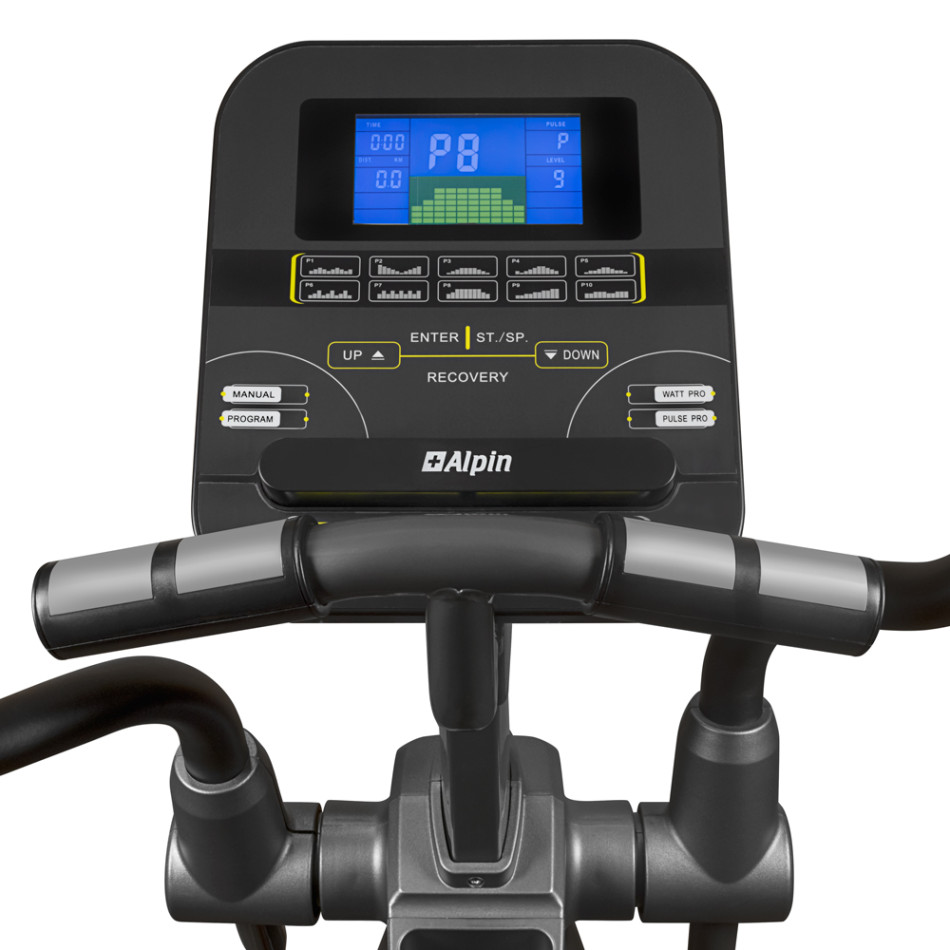 Alpin Edelweiss X-200 эллиптический тренажер с переднерасположенным маховиком. Такая конструкция является самой современной и перспективной разработкой в биомеханике эллипсоидов. Передний маховик позволяет значительно лучше смоделировать общую траекторию движения, уменьшить расстояние между педалями и добиться увеличения длины шага. В конечном счете, пользователь получает действительно эффективную и щадящую для суставов тренировку. Приводная система состоит из утяжеленного сбалансированного маховика инерционной массой 22 кг., трехкомпонентного дискового педального узла с реверсивным ходом, многожильного ремня и преднатяжителя, а также трех высококачественных подшипников. Длина шага составляет 520 мм. - это одно из максимальных значений в тренажерах такого типа. Конструкция тренажера выдерживает пользователя весом до 120 кг. Тренировочный компьютер представлен многофункциональным цветным LCD дисплеем размером 5.5 дюйма. В программный пакет входят 10 предустановленных программ, направленных на тренир