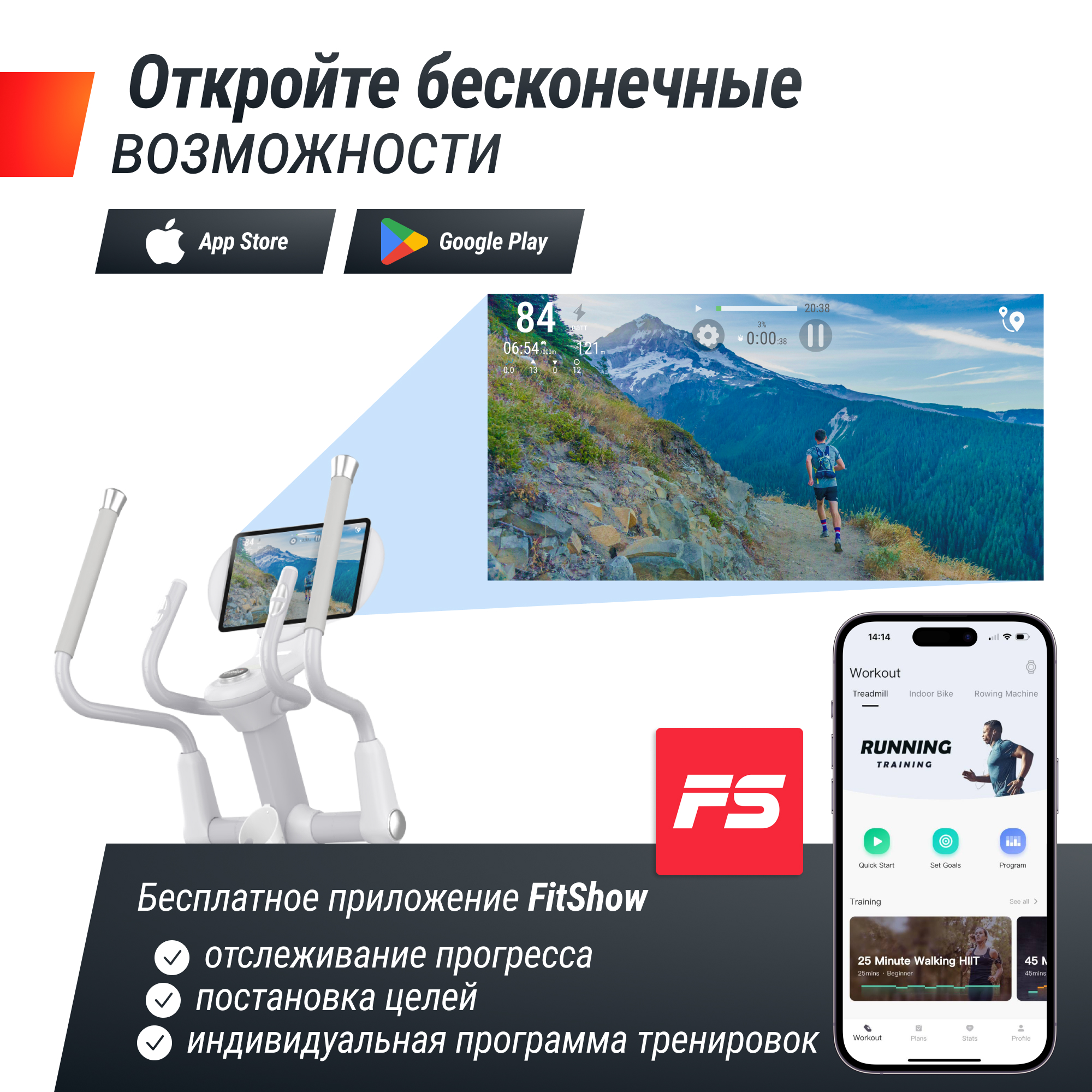 Мобильное приложение FitShow поможет поставить новые спортивные цели и достичь их благодаря индивидуальной программе тренировок, а также отследить прогресс. А встроенные Bluetooth динамики позволят включить любимую музыку и тренироватьс