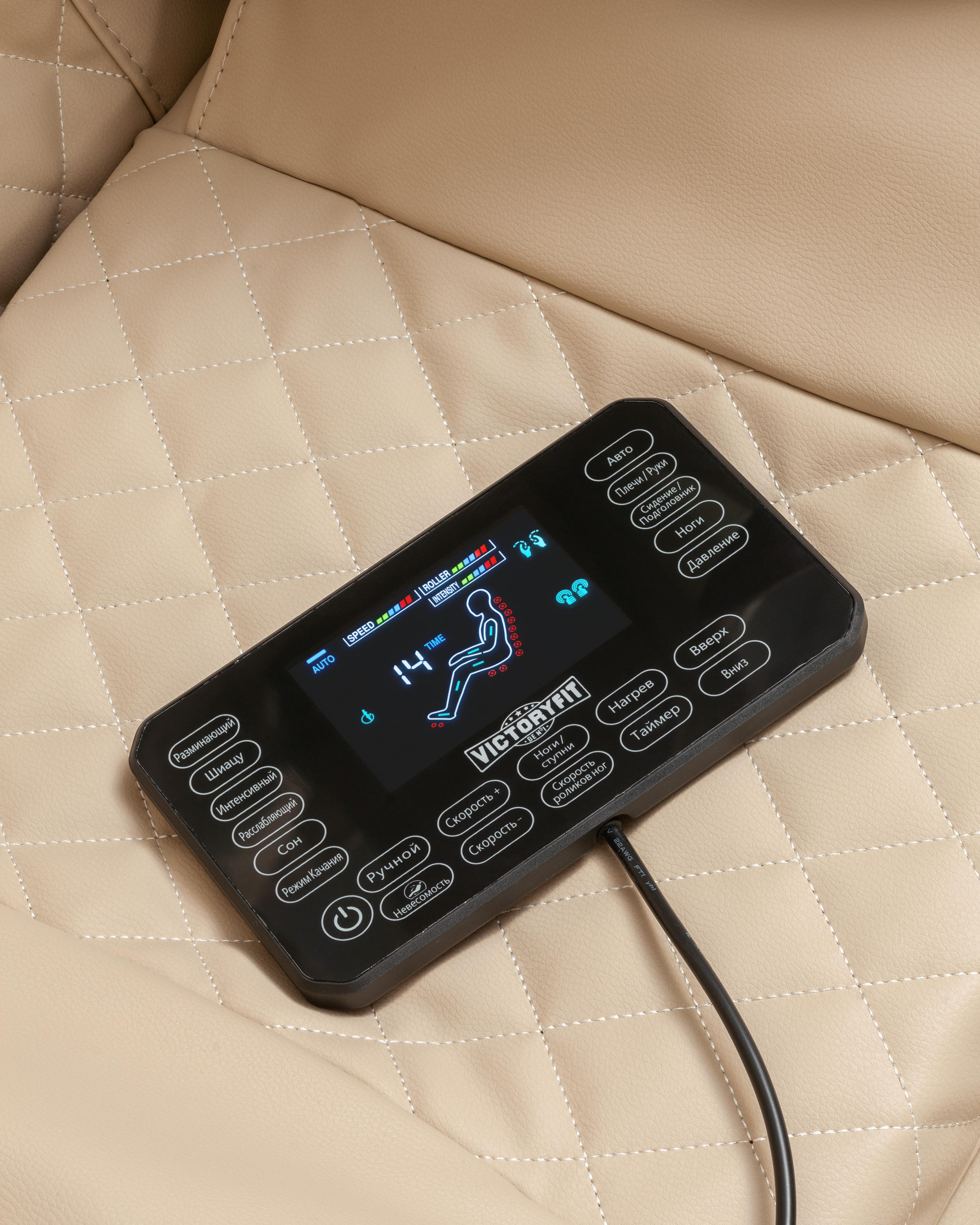 Кресло включает подвижные массажные группы роликов в поясничном отделе, спинном, шейном отделе, а также массажную группу роликов под ягодицами и стопами. Воздушно-компрессионный массаж голени, рук, ягодиц, плеч, головы. Предусмотрены следующие типы массажа: