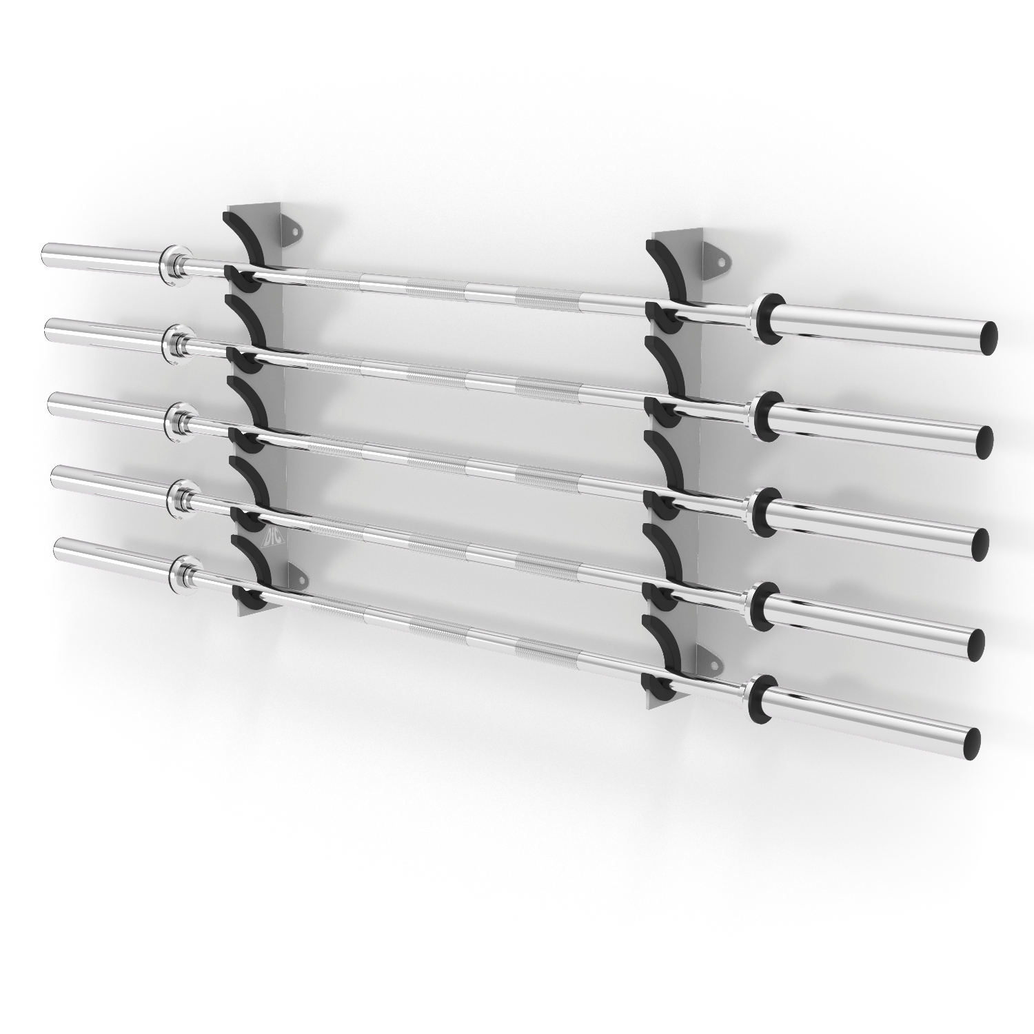 Максимальная нагрузка – до 300 кг. На ней можно хранить до 7 грифов диаметром 30 мм. Держатели крепятся на стену при помощи болтов из стали высокой прочности.